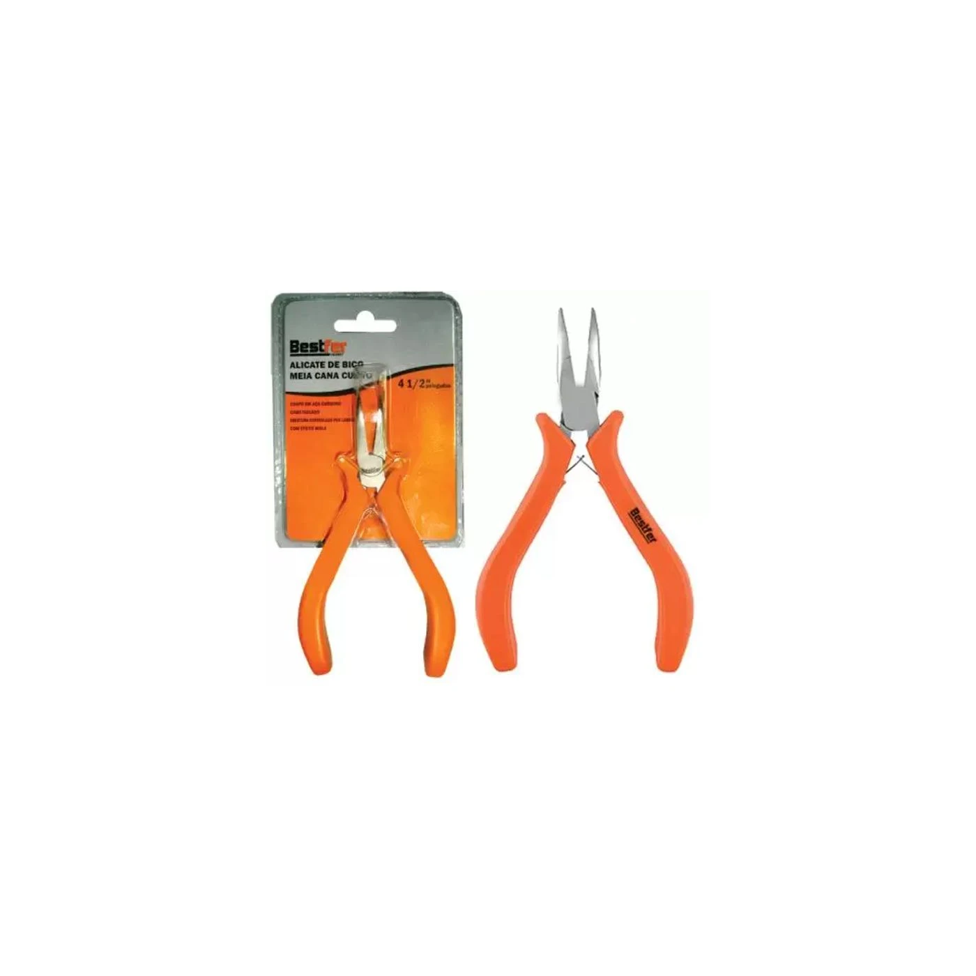 O alicate meia-cana de bico curvo 4,5 é uma ferramenta manual de tamanho compacto, feita de aço carbono niquelado com cabo isolado para maior segurança do usuário. Sua lâmina possui efeito mola para uma operação mais suave e precisa, facilitando o corte e dobra de fios e cabos elétricos. O alicate é ideal para trabalhos que exigem precisão e é uma ferramenta durável e de alta qualidade para atividades profissionais ou projetos DIY em casa.