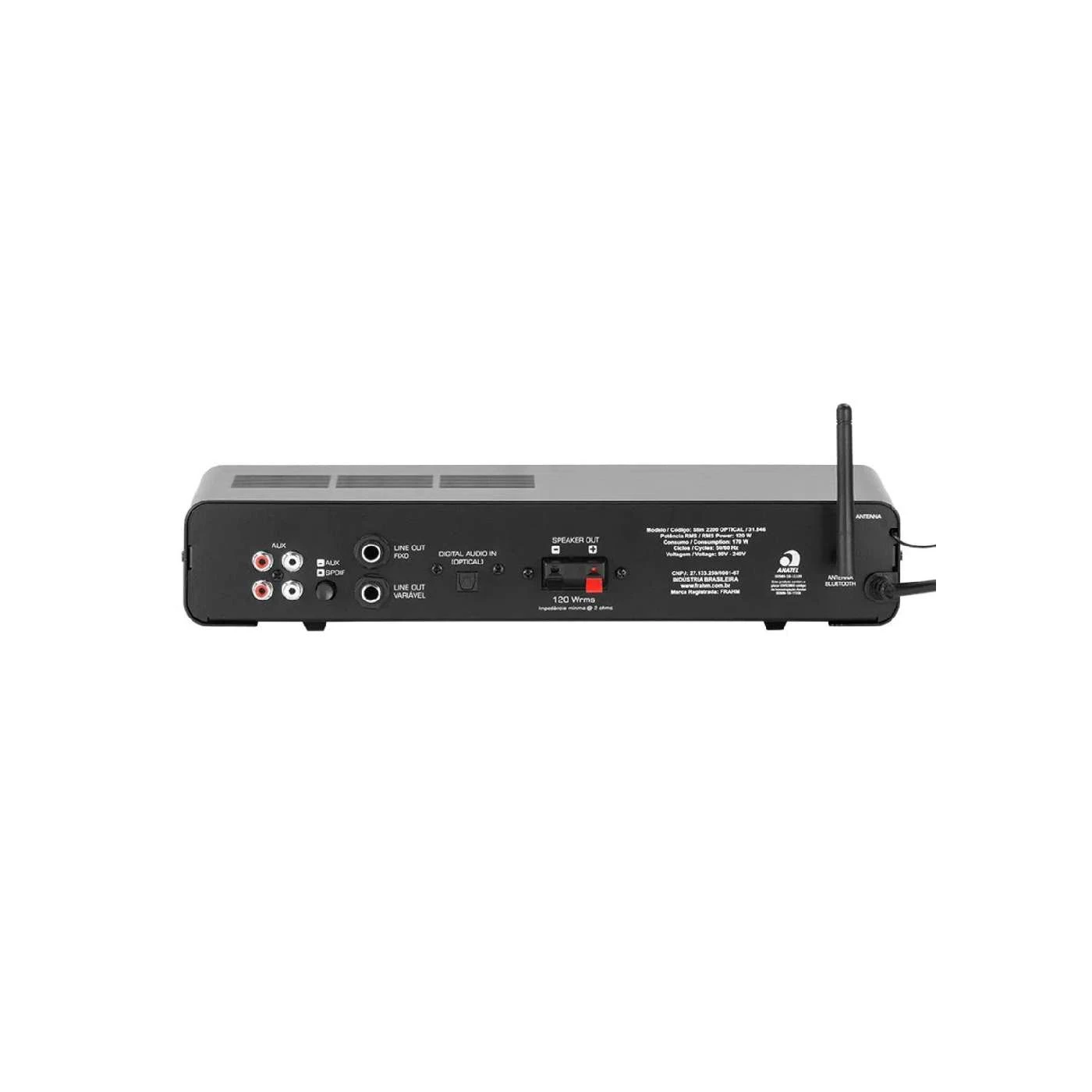 O amplificador Slim 2200 op da Frahm possui 120 Watts rms (2 Ohms) de potência e é ideal para ambientes de 100 m à 300 m. Possibilita comando de funções via Aplicativo Frahm, além das entradas usb, sd Card, auxiliar (rca), Microfone, Rádio fm e Bluetooth.