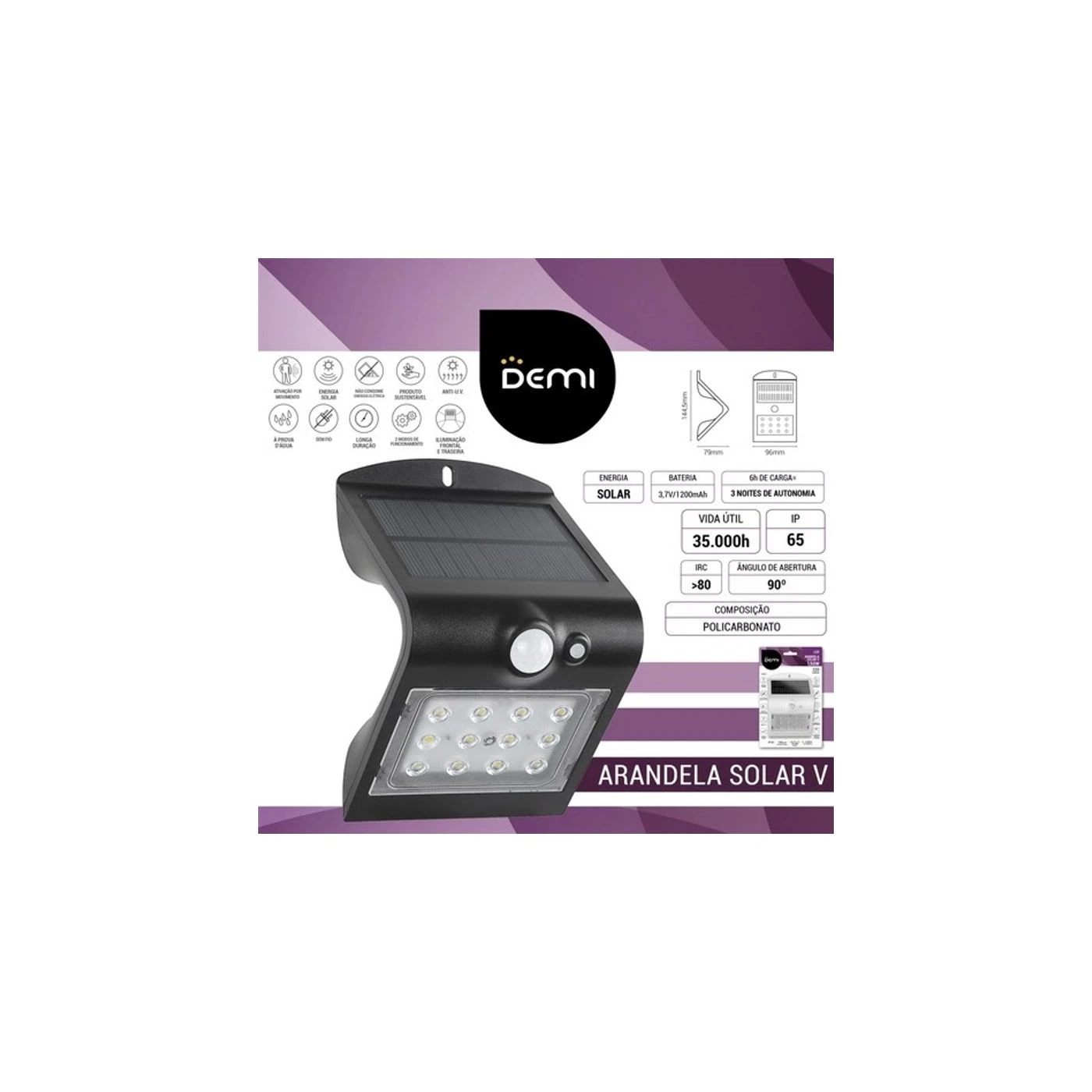 01 - arandela solar led 1,5w 6500k ip65 com sensor de movimento preta demi