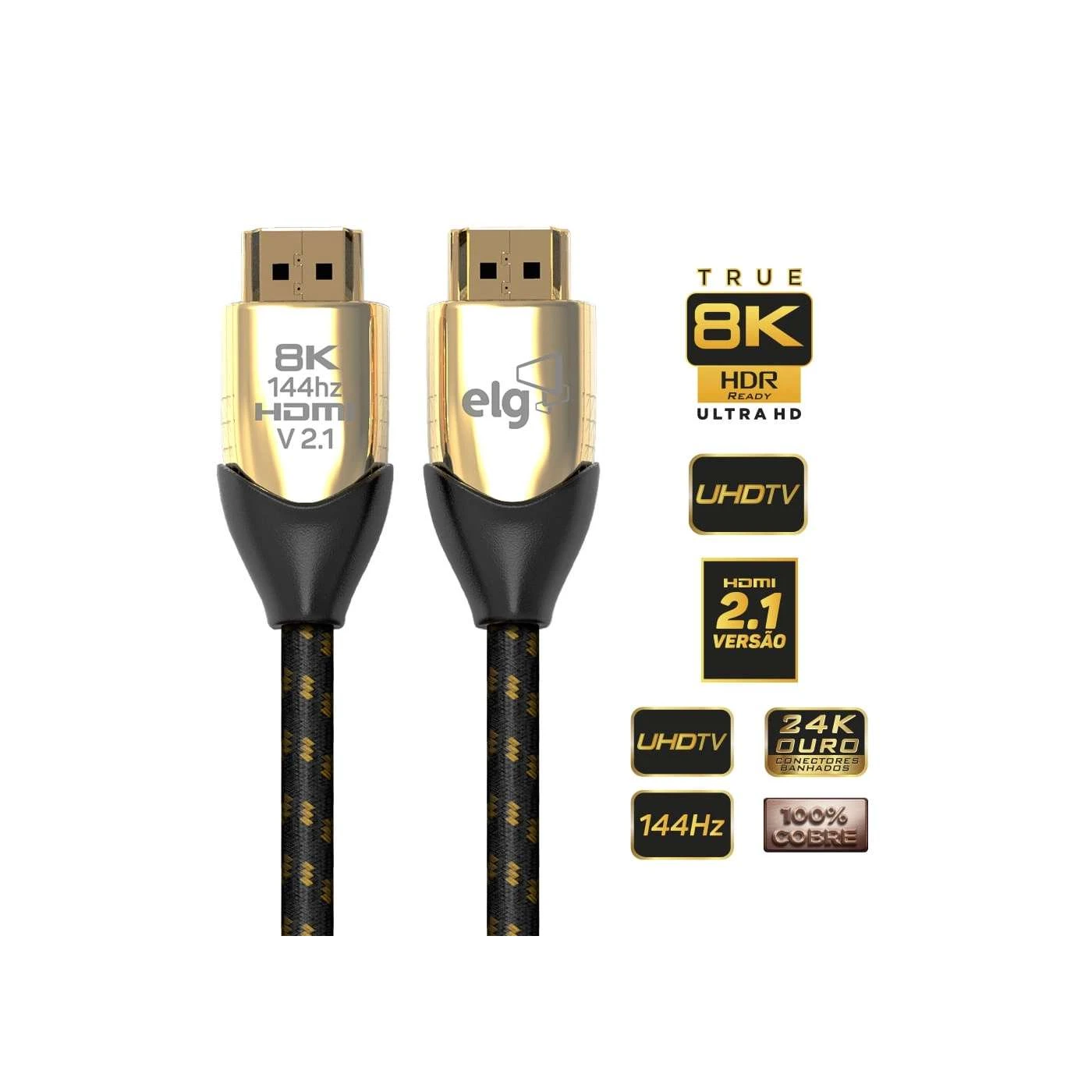 O HS8K20 ELG é um cabo HDMI PREMIUM que garantirá a você o mais alto nível de qualidade de imagem e som, atendendo aos padrões de resolução de vídeo 8K/120Hz ou 4K/144Hz Ultra HD, além de resolução Ultra HD de 7680 x 4320px. Conta também com conectores banhados a ouro 24K e é compatível com TVs LED, Plasma, LCD, 3D,8K, 4K, Notebooks, Consoles, Blu-ray, DVD Players, Receivers.