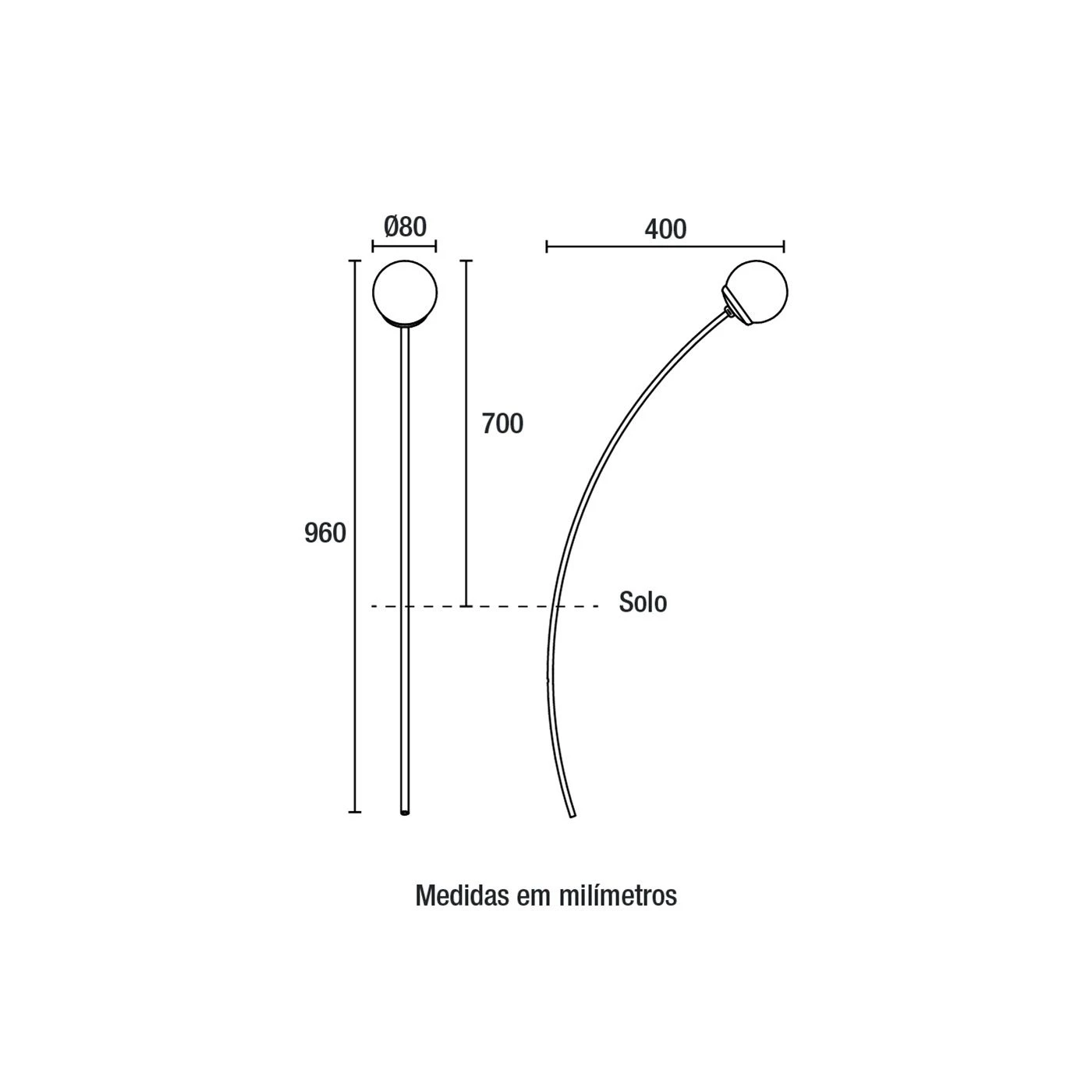 Possui globo de vidro leitoso rosqueável e instalação através de fixação da sua haste ao solo. Possui alto índice de proteção IP54 e soquete para lâmpada G9.