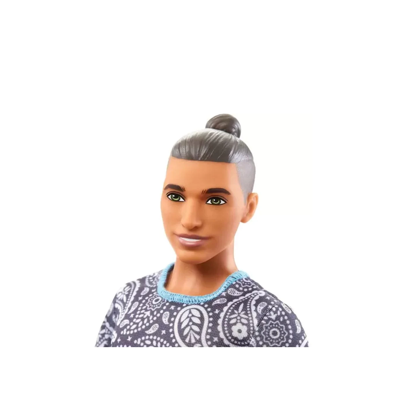 O boneco Ken tem um corpo largo e cabelos castanhos em um coque, sua camiseta cinza e shorts azul aqua ostentam uma estampa paisley para um visual divertido.