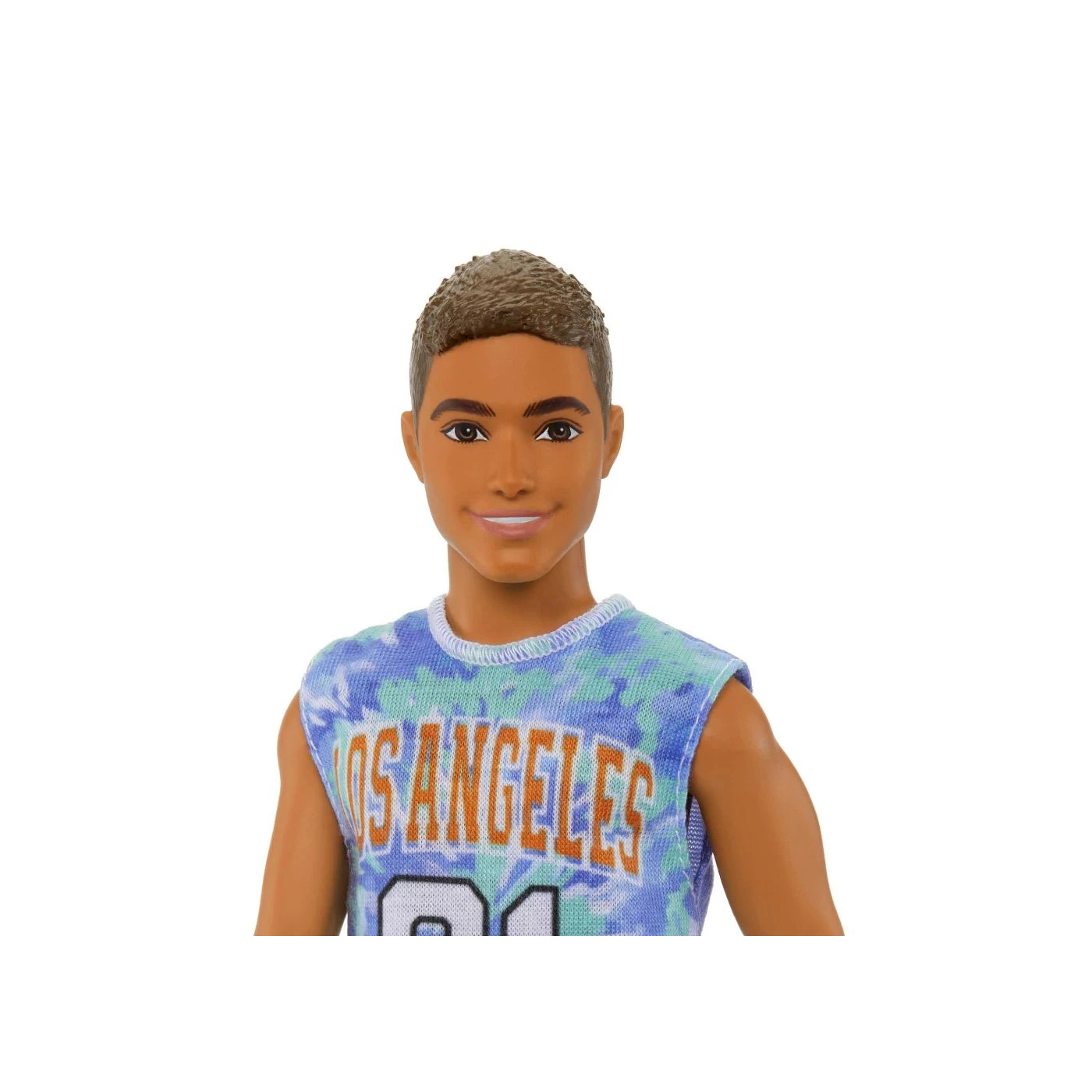 Esta boneca Ken tem cabelos castanhos e uma perna protética. Ele usa uma camisa tie-dye de Los Angeles que realmente faz sua personalidade estourar!