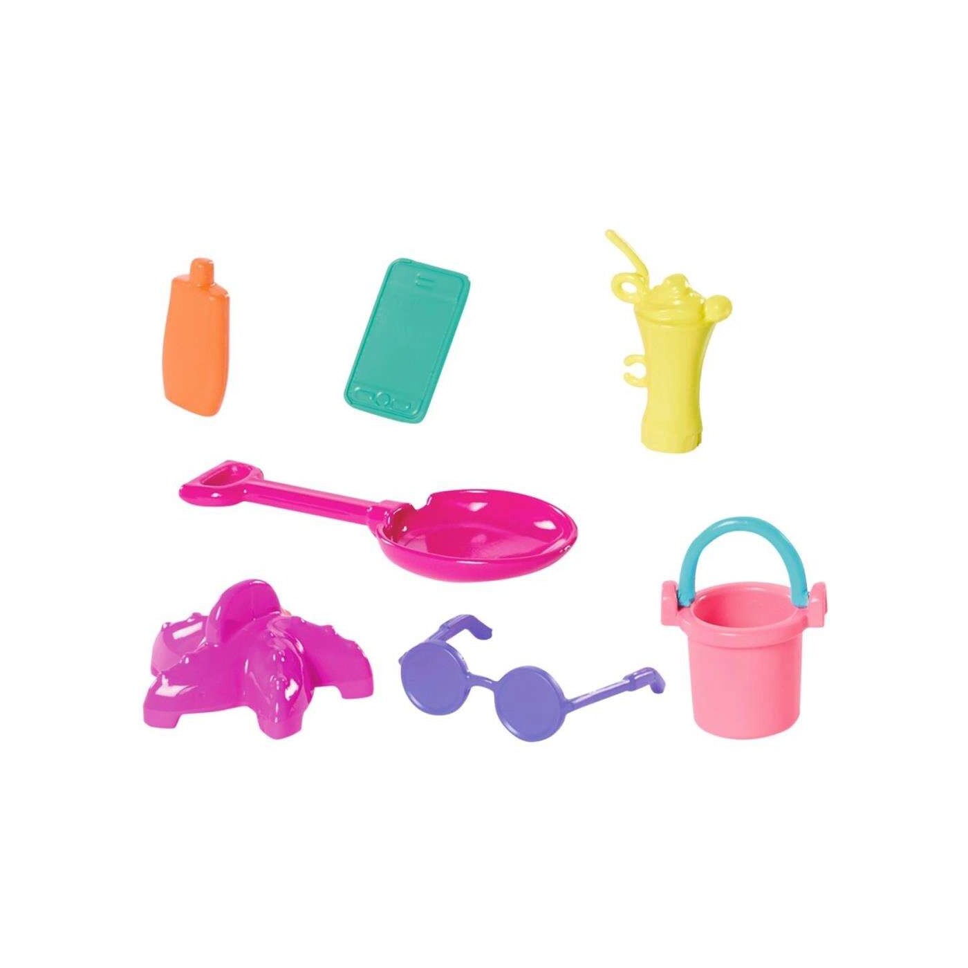 Com os 10 itens ( 1Guarda-sol, 1 cadeira espreguiçadeira, 1 toalha de praia, 1 óculos de sol, 1 celular, 1 protetor solar, 1 copo de suco, 1 balde, 1 pá e 1 estela do mar) fazem a imersão ser muito maior para a criançada que adora se divertir ao lado da Barbie.