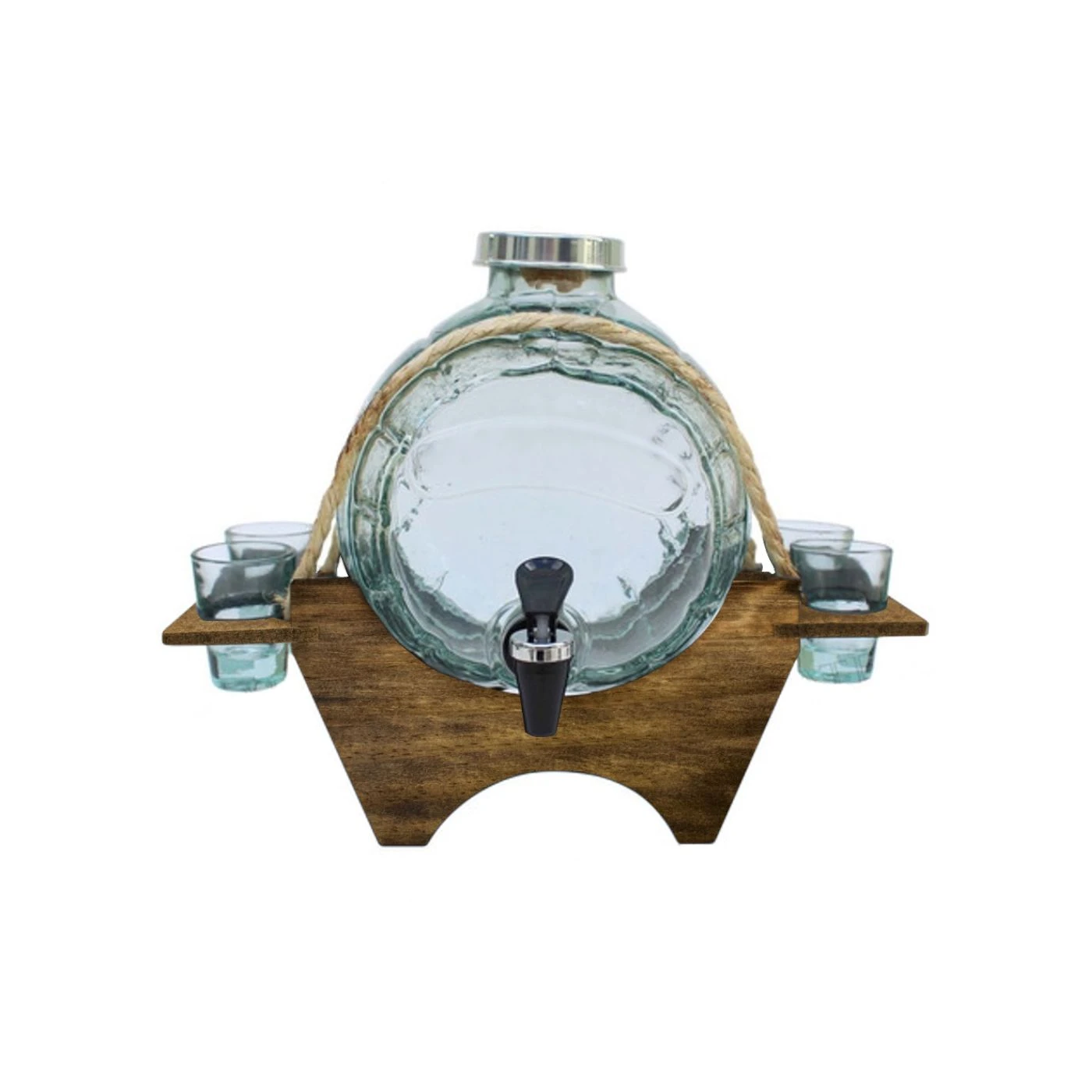 Ancorote de vidro, acompanhado com quatro copinhos de vidro modelo aperitivo. Produto desenvolvido exclusivamente para você colocar vinho, licores, batidas entre outras infinidades.