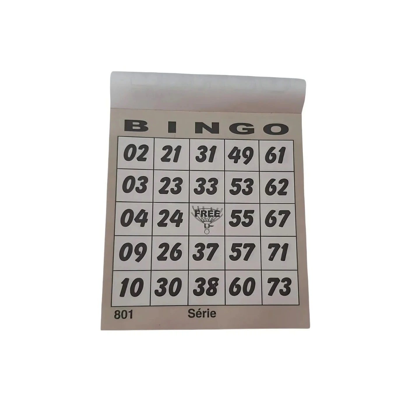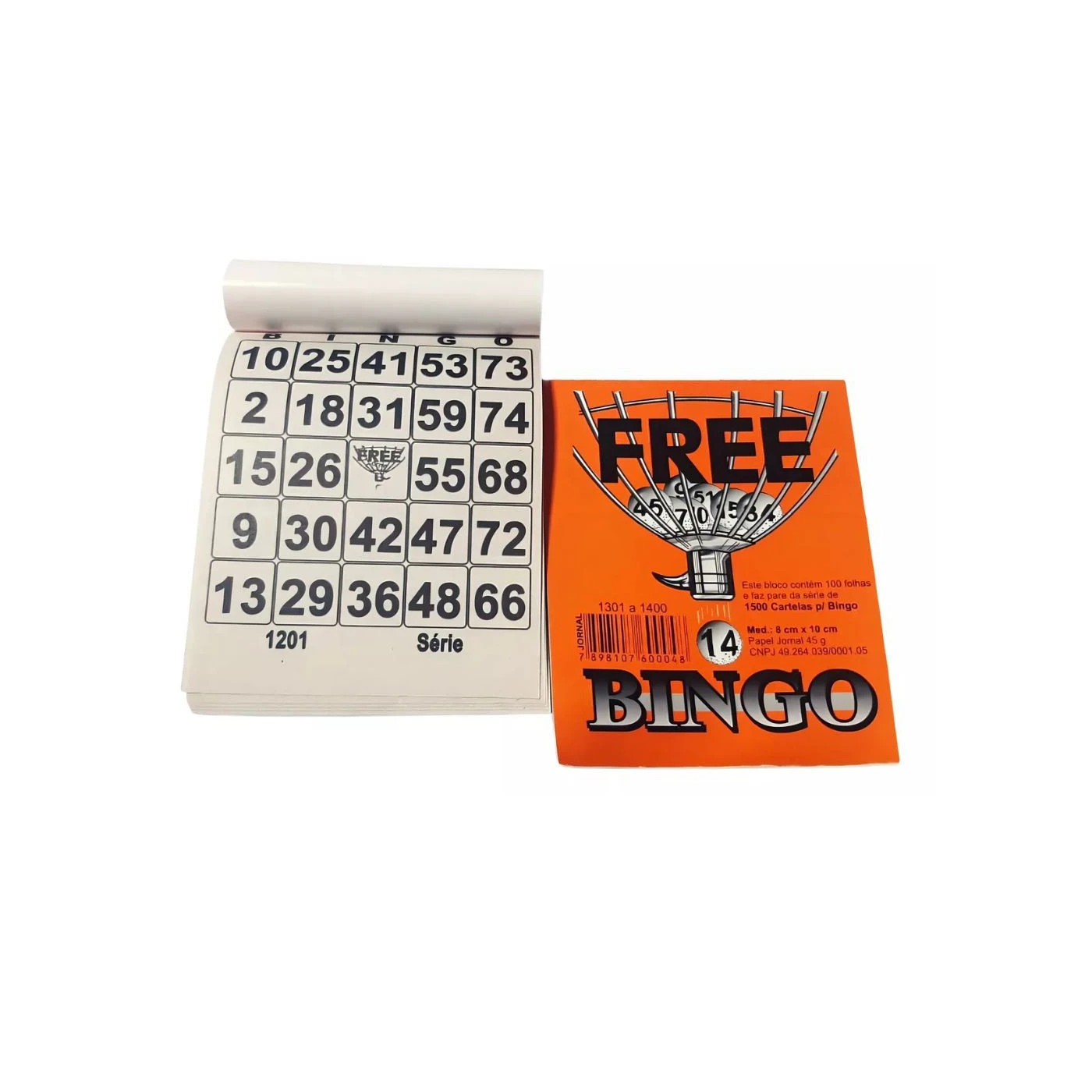 Bloco de cartelas de bingo Free com 100 unidades, ideal para eventos, festas, bingos beneficentes e confraternizações. As cartelas são destacáveis e vêm numeradas, oferecendo praticidade e organização para os participantes. O produto é fabricado com papel de boa qualidade e impressão nítida, garantindo durabilidade e fácil visualização dos números.