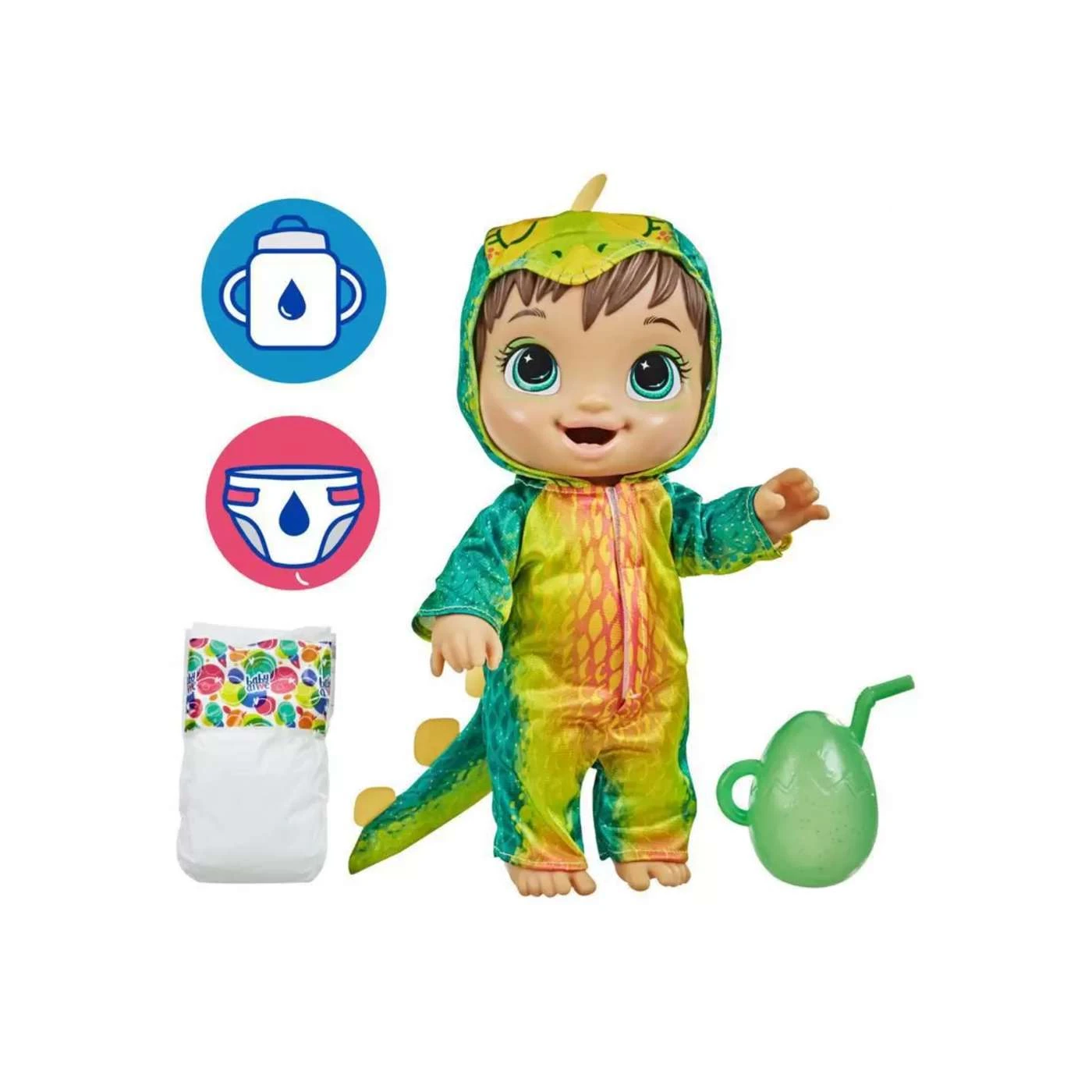 As crianças podem imaginar várias aventuras com esta boneca Baby Alive Bebessauro roupa de Dinossauro removível e mamadeira.