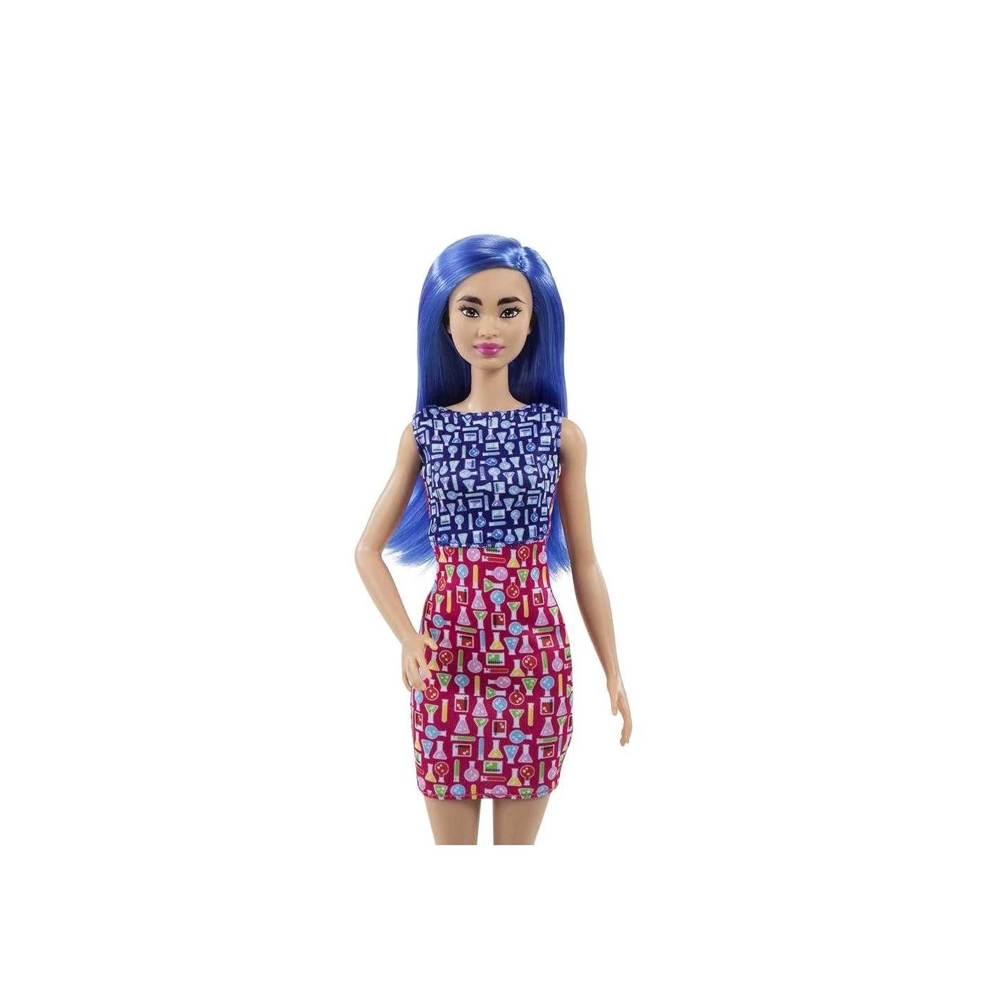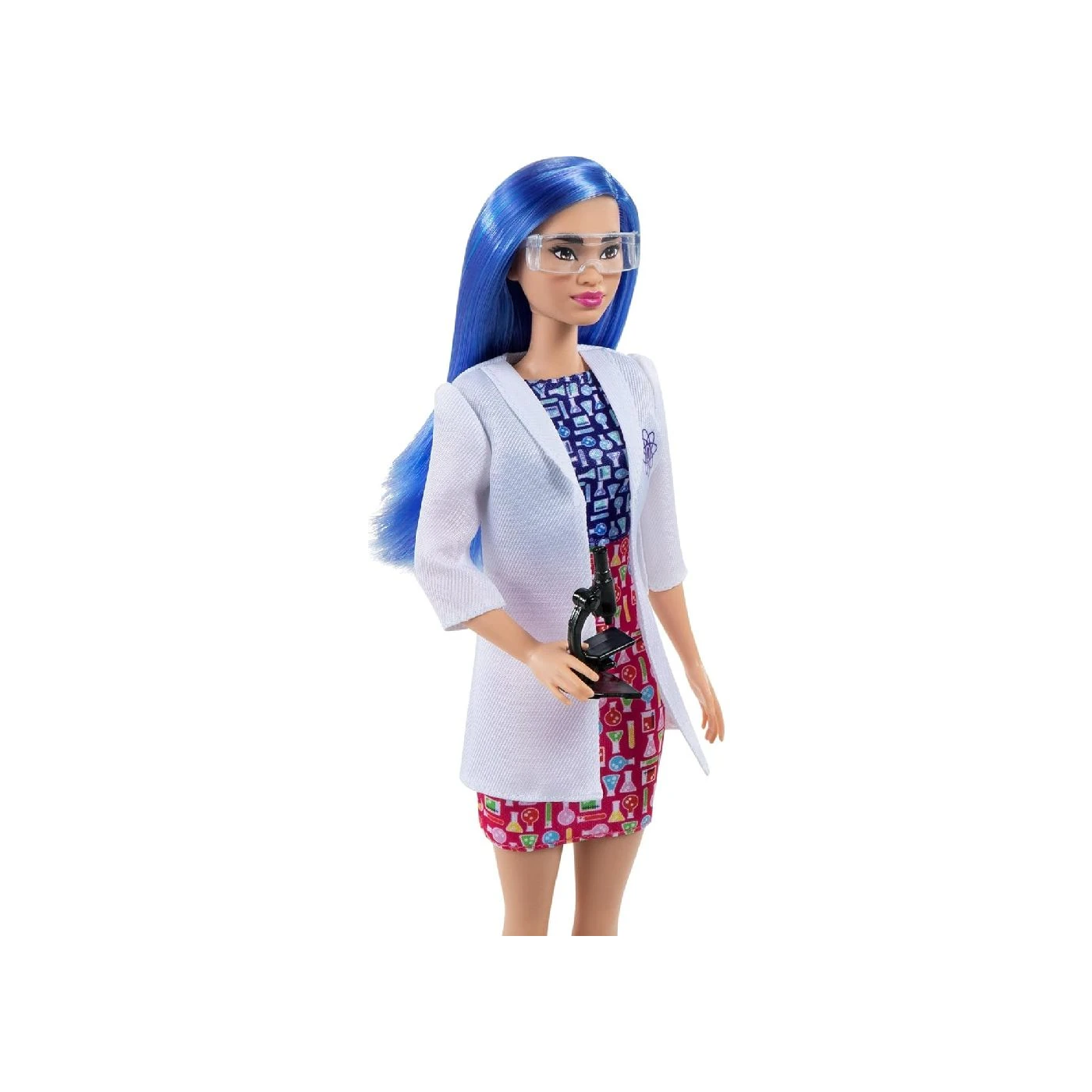 Vestindo um vestido colorido com jaleco (com um logotipo inspirado na ciência) e sapatilhas, a boneca cientista Barbie 29 cm tem cabelo azul colorido e vem com óculos de proteção e um microscópio para fazer uma descoberta científica!