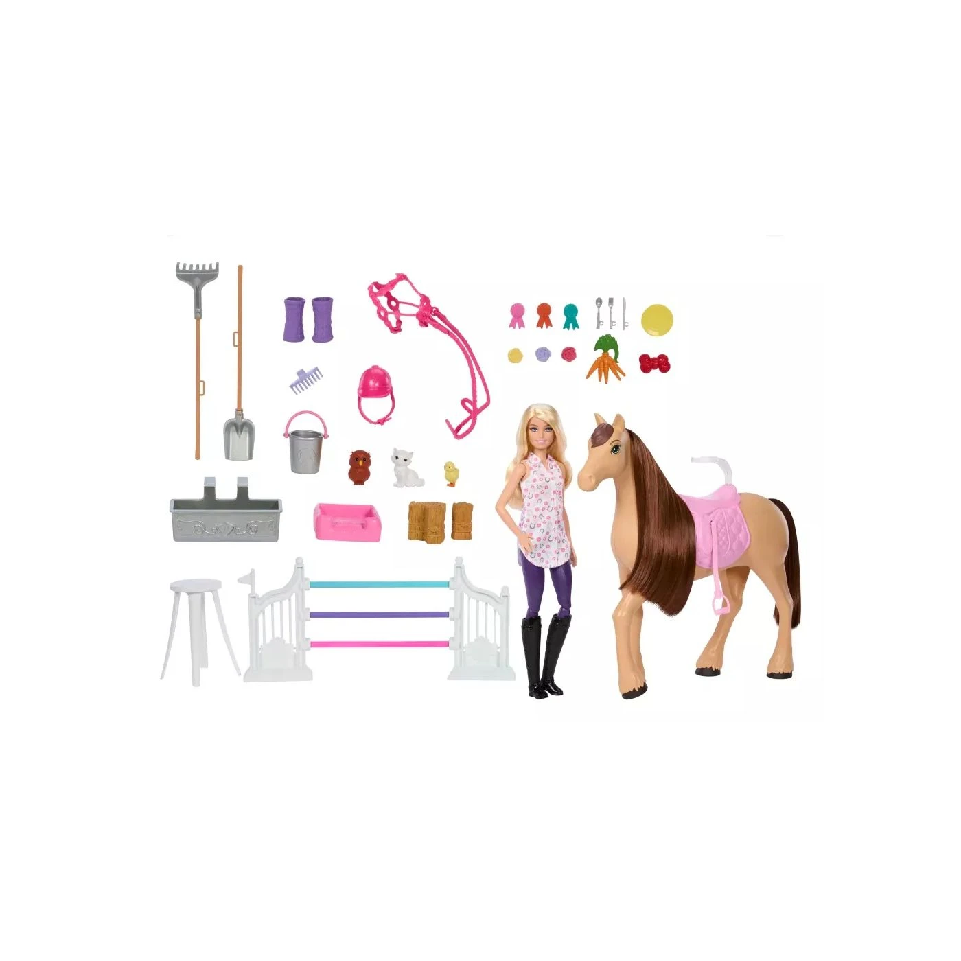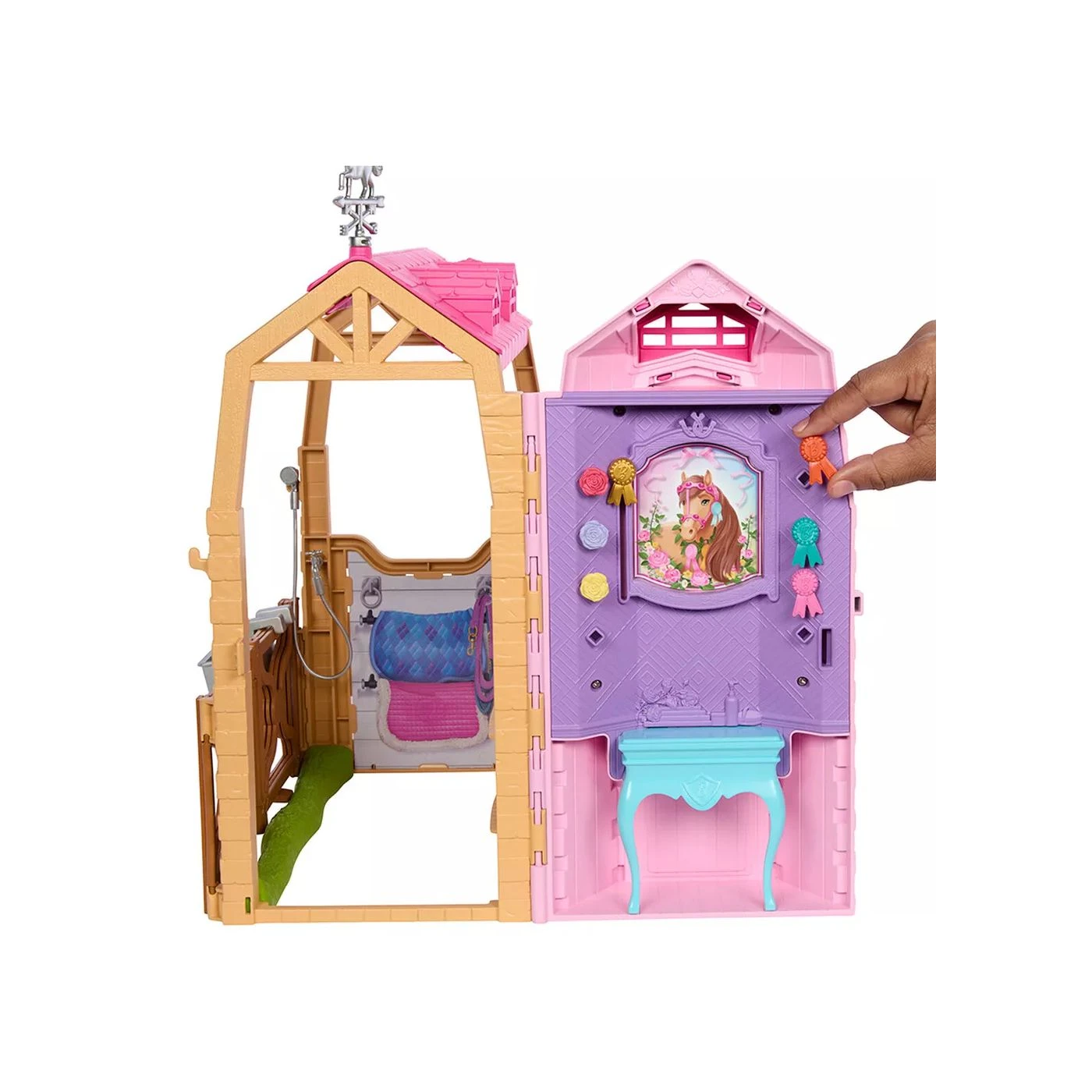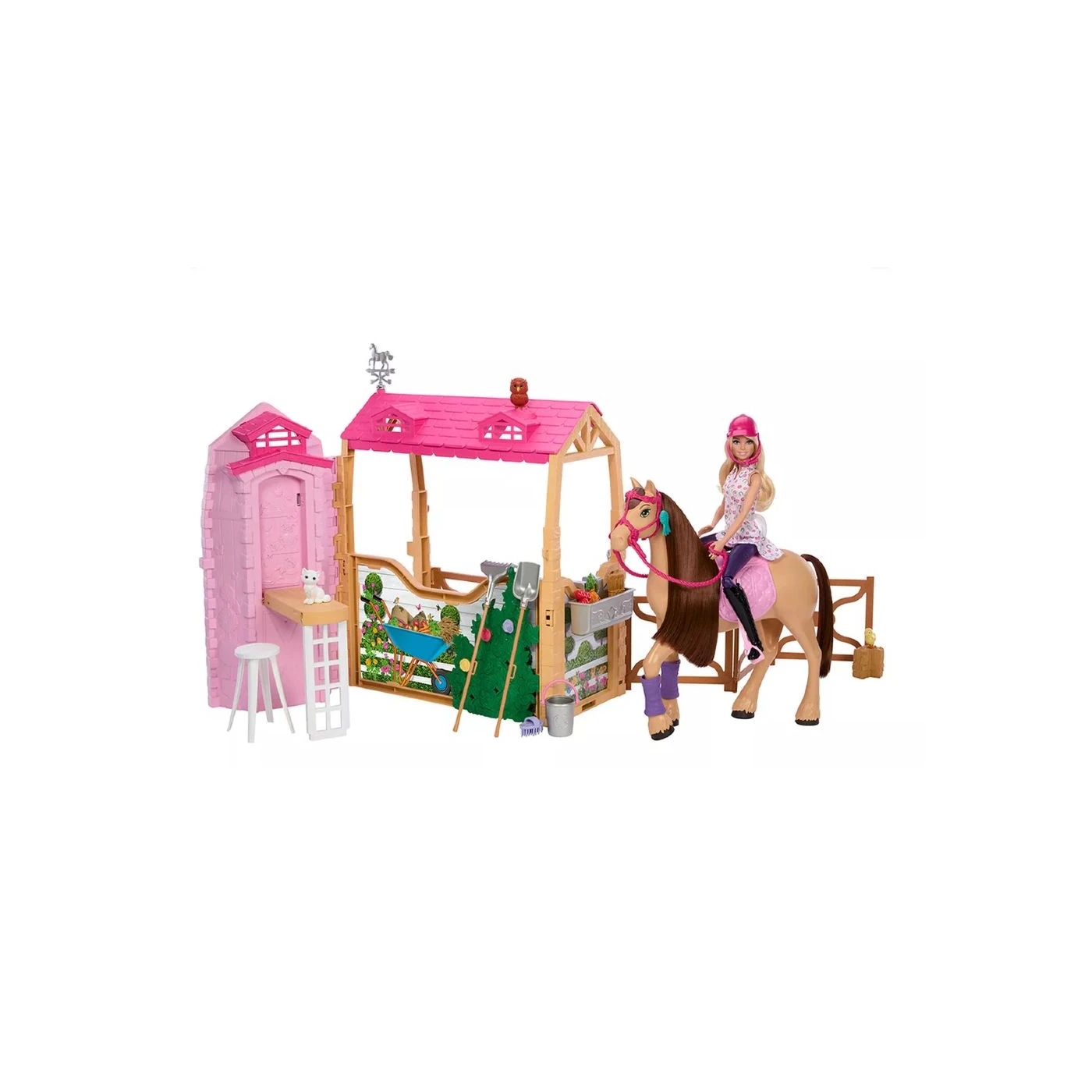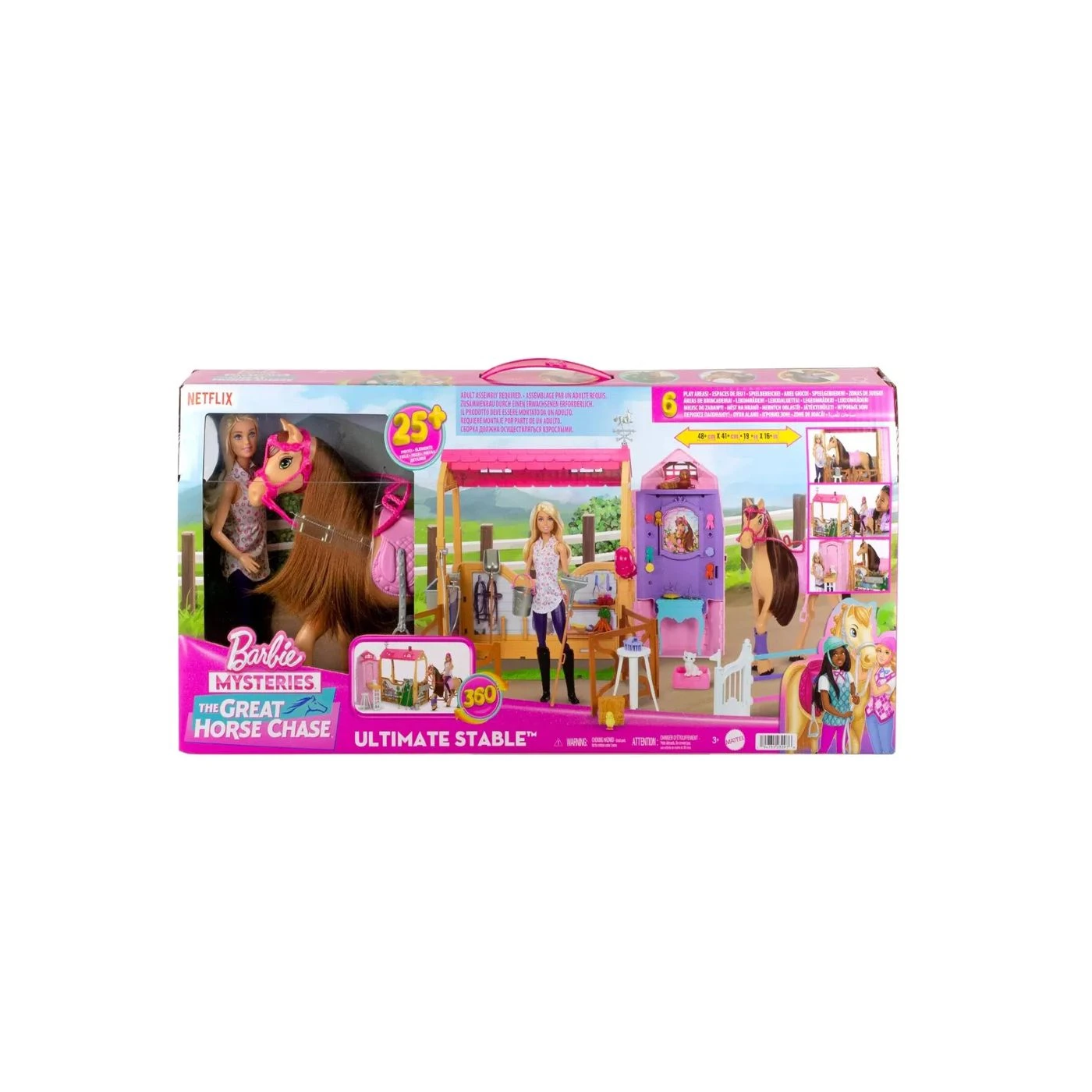 Inspirado na série Barbie Mysteries: The Great Horse Chase da Netflix, este conjunto de brinquedos Ultimate Stable de mais de 25 peças está cheio de diversão! Com seis áreas de brincadeira, as crianças podem ajudar a boneca Barbie a tratar seu cavalo de brinquedo com vegetais deliciosos no posto de alimentação, limpar e escovar seu cavalo na área de tosa, treinar na cerca de salto, pendurar fitas ou deslizar e trocar fotos na parede de troféus e cuidar do jardim com rosas plug n play.