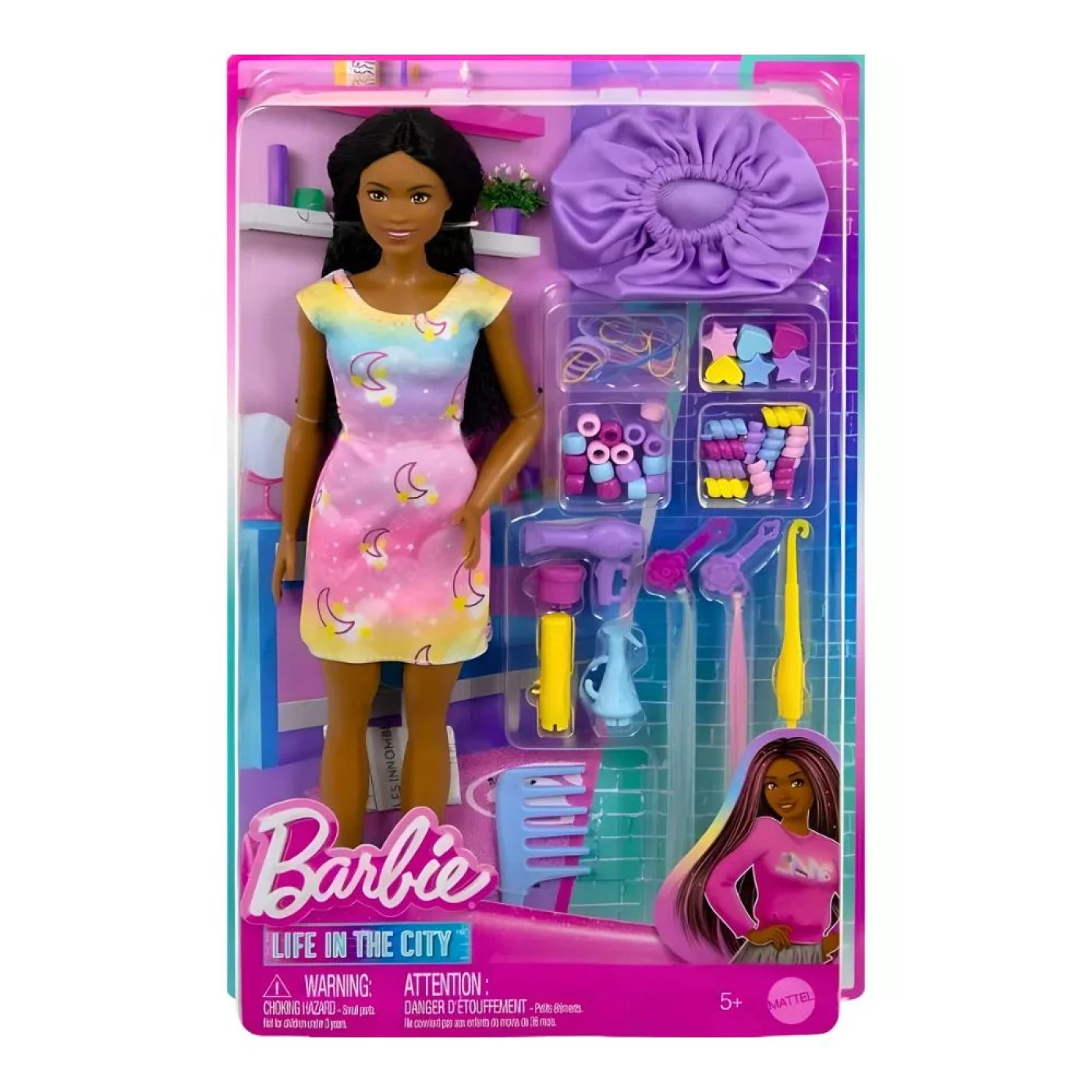 Os jovens estilistas podem criar infinitos penteados para a boneca Barbie com este conjunto que inclui mais de 50 peças para a diversão com o penteado! Há uma ferramenta de miçangas e um pente, um secador de cabelo de brinquedo e muitos acessórios para o cabelo. As crianças podem criar um visual, representar uma história e depois mudá-lo completamente. Para crianças a partir de 5 anos.. A boneca não pode ficar em pé sozinha. Cores e decorações podem variar.