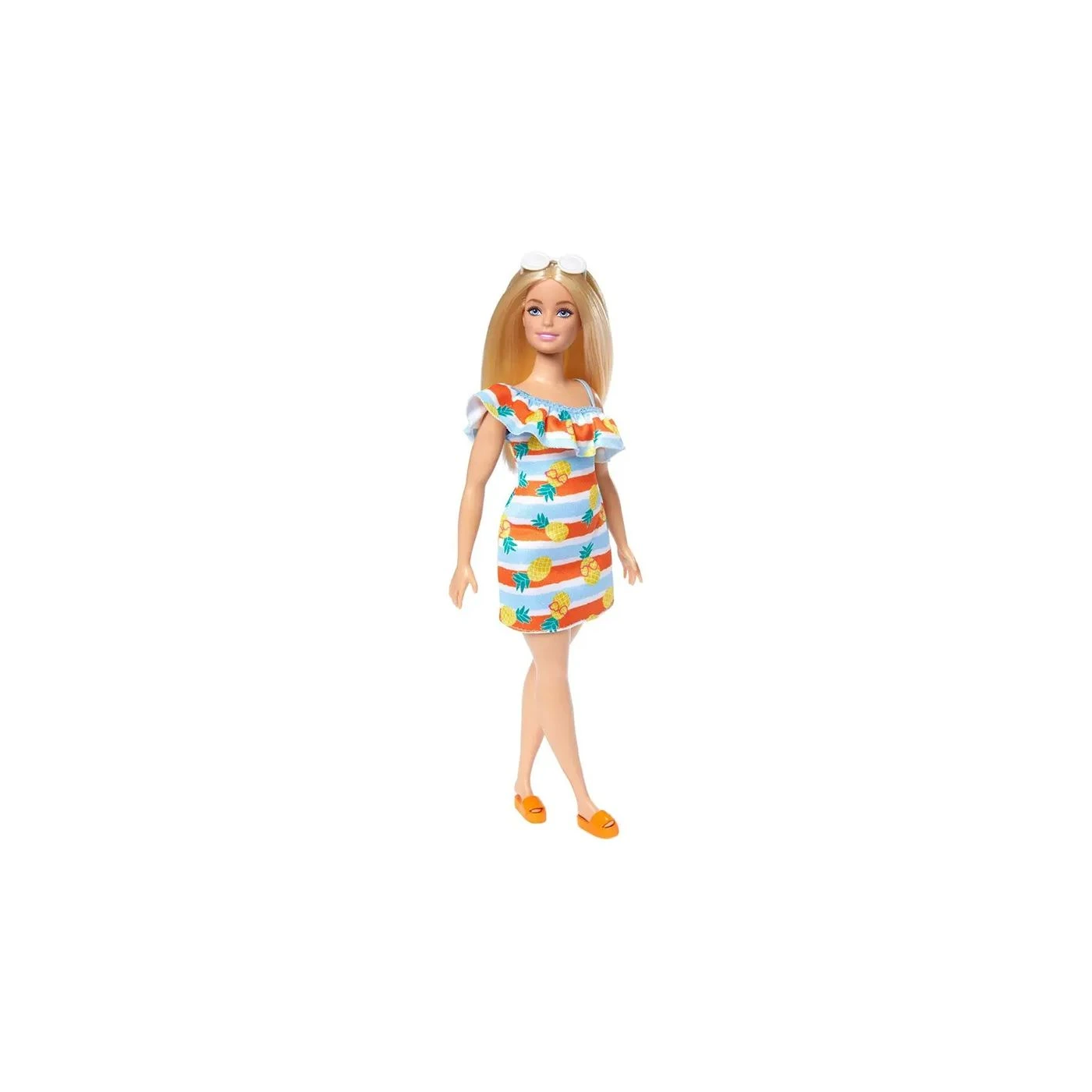 A coleção Barbie Loves the Ocean apresenta diversas bonecas, tecidos e acessórios feitos de materiais reciclados e plásticos provenientes dos oceanos. A boneca Barbie tem formato de corpo original e cabelos loiros. Ela está pronta para o verão com um lindo vestido de verão com estampa tropical laranja e amarelo, com uma fita rosa acetinada na cintura.