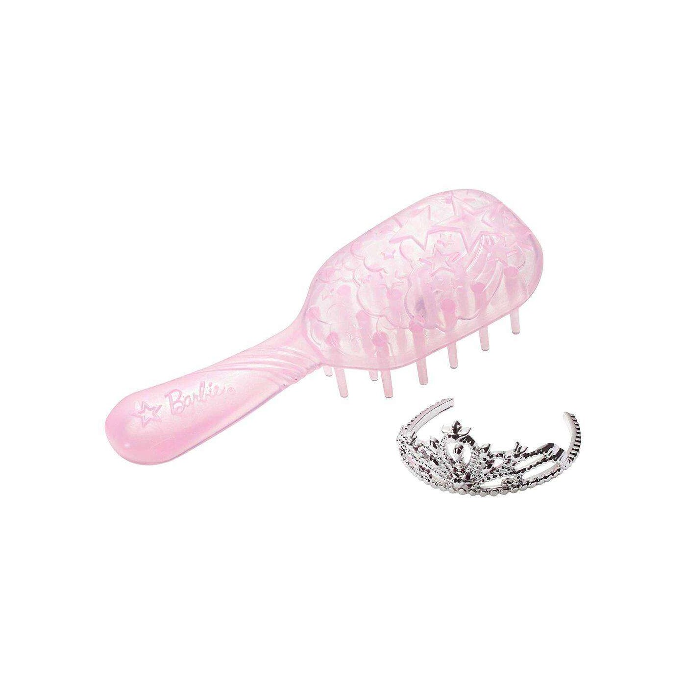 Uma mecha rosa gelo nos longos cabelos loiros da boneca Barbie adiciona um toque de fantasia e uma escova de cabelo é incluída para que jovens imaginações possam ajudá-la a se preparar para uma aventura real.