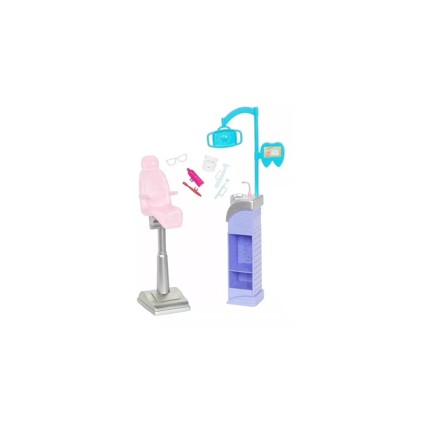 Este playset vem com duas bonecas, uma estação odontológica, cadeira de paciente e acessórios menores como instrumentos odontológicos, escova e pasta de dente.