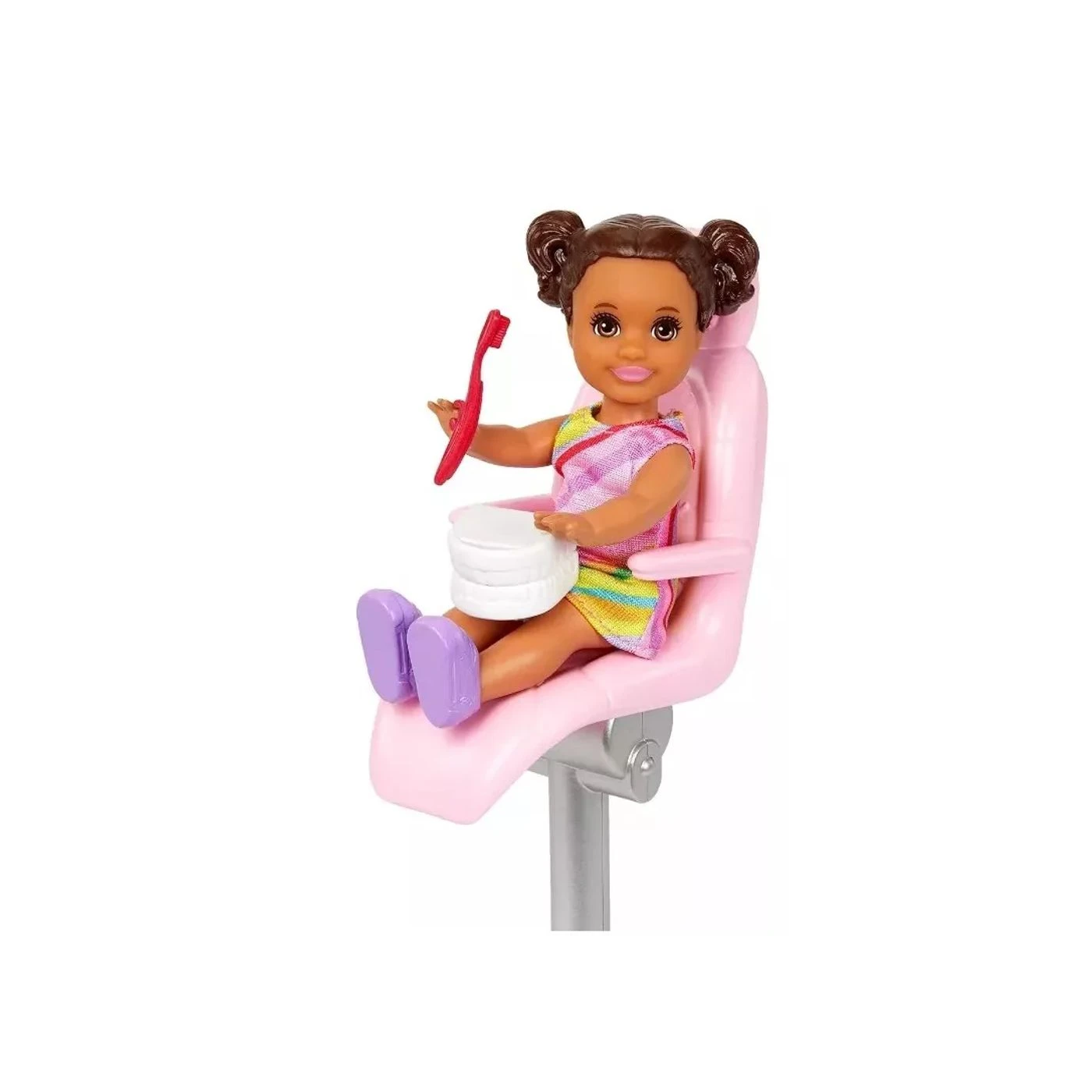Vestida com seu jaleco branco, a boneca Barbie Dentista está pronta para cuidar de seu adorável paciente.