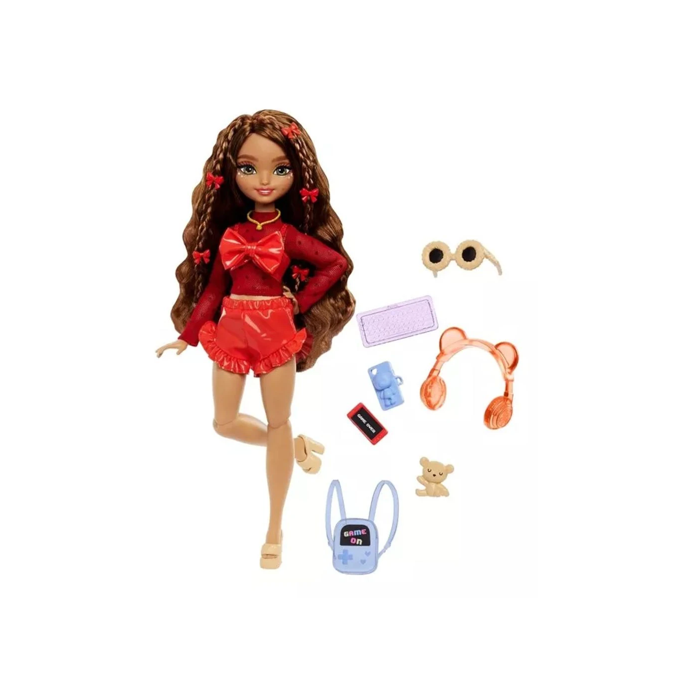 A boneca é ajustável e usa Fashions removíveis, como um top de bolinhas com um laço vermelho brilhante, shorts que combinam com o top e saltos altos.
