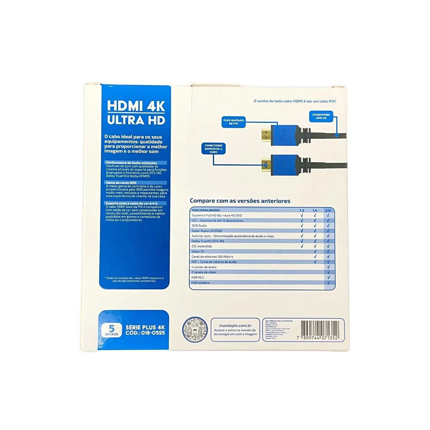 O cabo ideal para os seus equipamentos: qualidade para proporcionar a melhor imagem e o melhor som Performance de áudio otimizada Desfrute de som com qualidade de cinema através do suporte para funções avançadas e formatos como DTS-HD. Dolby TrueHD e Dolby ATMOS Gama de cores HDR A maior gama de contraste e de cores proporcionada pelo HDR permite imagens muito mais realistas e impactantes, para uma experiência de cinema na sua casa Suporte total à saída de cor 4:4:4 O cabo HDMI Gold da PIX é compatível com saída de cor sem compressão em resolução total, possibilitando a melhor qualidade em games e conteúdos de mídia em computadores