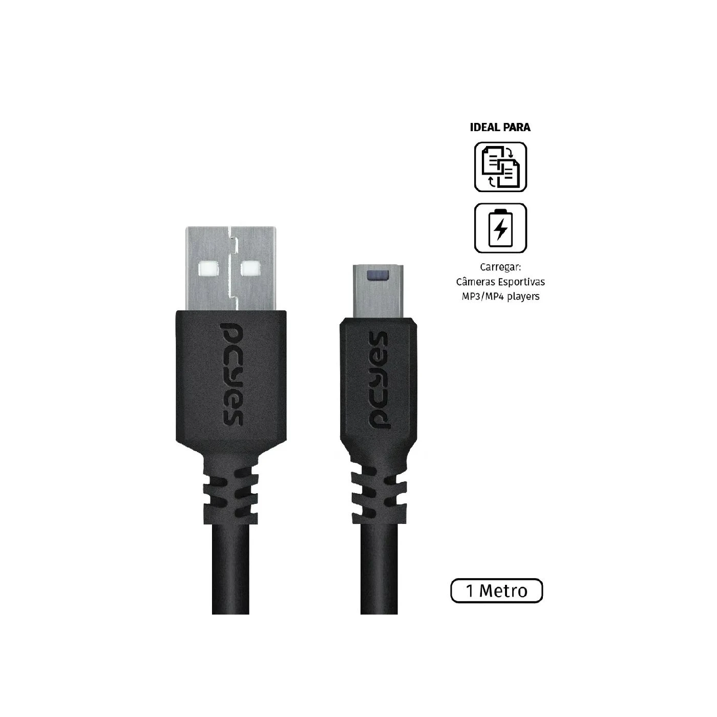 Este cabo permite conexão entre computadores e câmeras esportivas, celulares (antigos), MP3 / MP4 players, caixas de som pequenas, HDs externos, vídeo games portáteis ou controles sem fio de video games de diversas marcas com conexão através de porta Mini USB B.