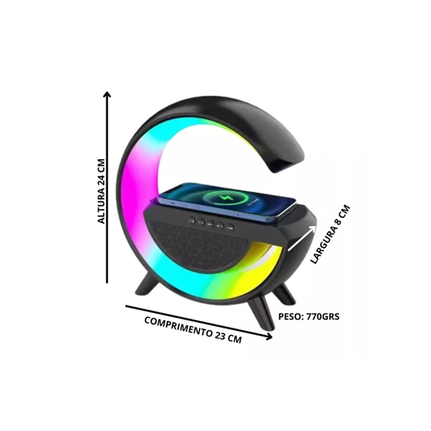 A luminária CAIXA DE SOM LUMINARIA G RGB CARREGADOR HM-2301 é um dispositivo multifuncional que combina iluminação, entretenimento e funcionalidade em um único produto. Esta luminária inovadora não só fornece luz ambiente ajustável, mas também oferece a capacidade de reproduzir música e carregar dispositivos eletrônicos, tornando-a uma adição versátil para qualquer ambiente.