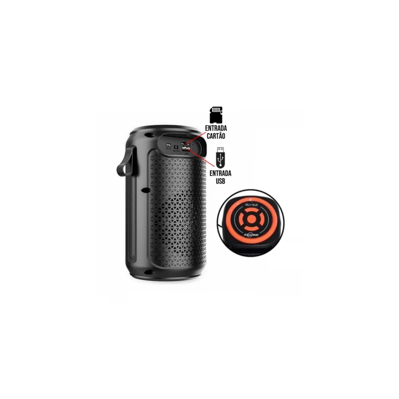 A caixa de som GTS-1732 conta com Alto-falante 2″ com luz LED RGB. Entrada USB para Pen Drive, cartão de memória e função rádio FM, com bateria recarregável e inclui cabo V8 para carregamento.