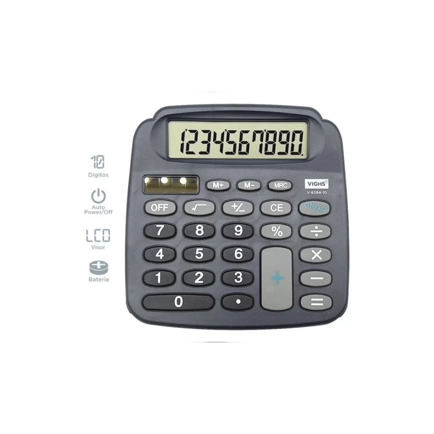 A calculadora V-808A-10 da Vighs funciona atraves de uma pilha botão. Este produto é para ser utilizado em cima de uma mesa, seu visor LCD é inclinado justamente para ter a melhor visualização possível enquanto estiver sentado. Algumas operações básicas são; auto off, porcentagem, raiz quadrada e a tecla de retorno.