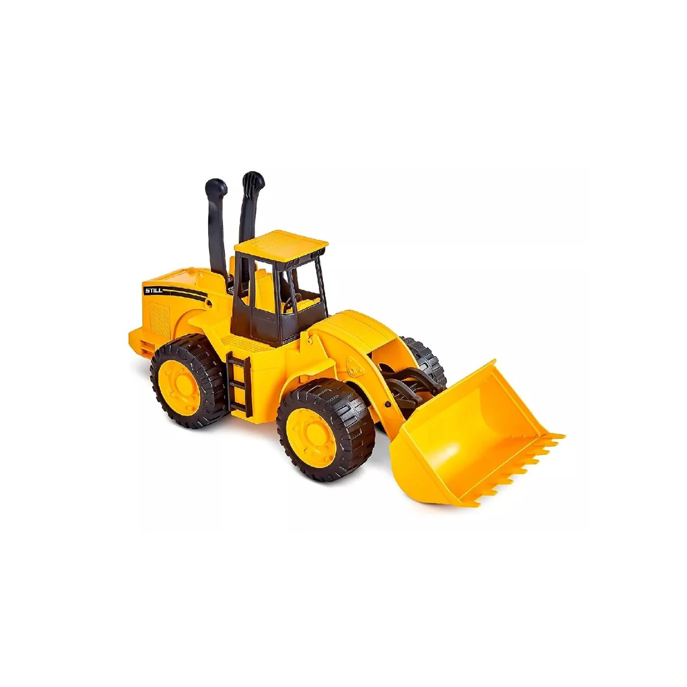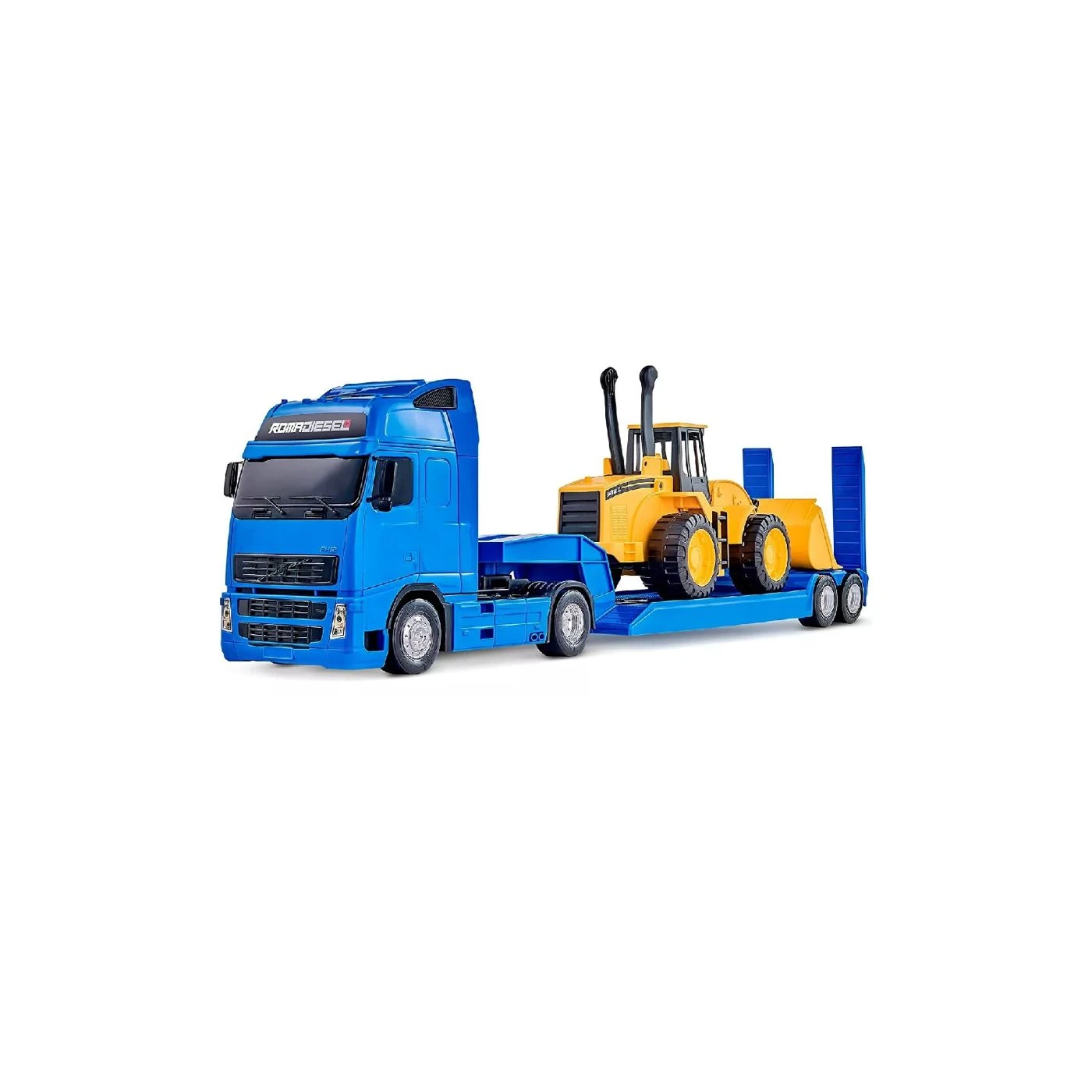 O conjunto conta com caminhão e trator modelo carregadeira, ambos contam com rodas de movimento livre e detalhes idêntico aos modelos reais. O caminhão conta com aproximadamente 80 cm de comprimento e possui uma rampa para carregar os veículos, já a carregadeira possui aproximadamente 40 cm de comprimento e conta com comandos para levantar e movimentar a pá carregadeira, deixando a brincadeira ainda mais divertida.