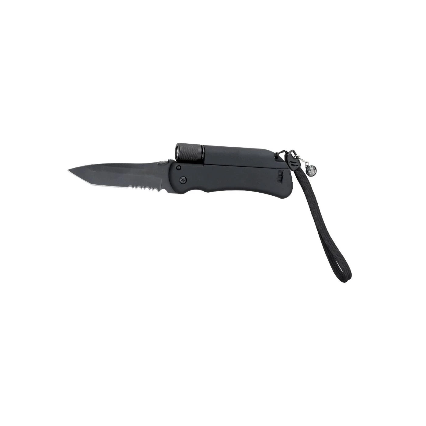 O canivete Survival da Guepardo possui revestimento tático, trava liner lock, mini lanterna em LED, pedra para faísca, pederneira, apito de emergência, cordão em nylon, com clip passador e trava de segurança manual.