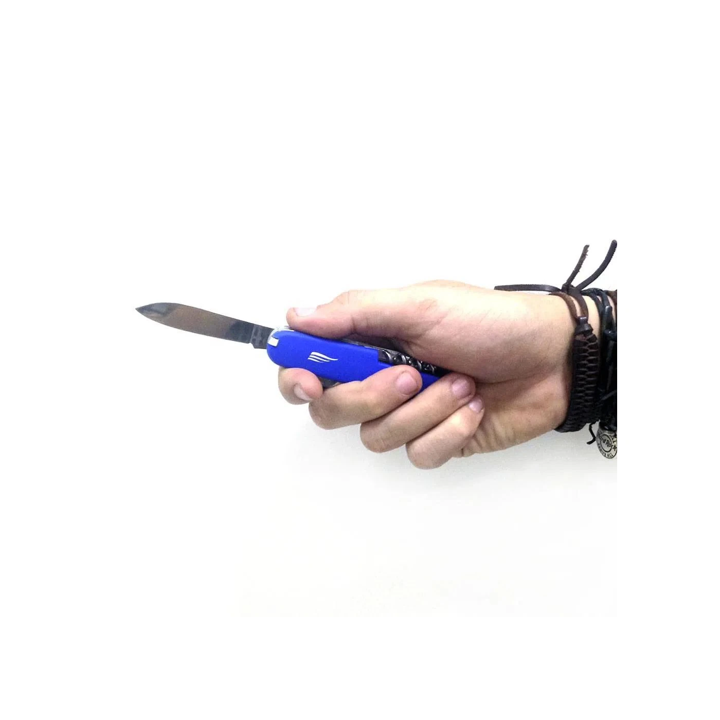 Possui 15 funções: lâmina grande, serra de madeira, descamador de peixes, removedor de anzol, abridor de latas, abridor de garrafas, chave de fenda, tesoura, chave Philips, punção, lima, punção com orifício para costura, palito, pinça e saca-rolhas.