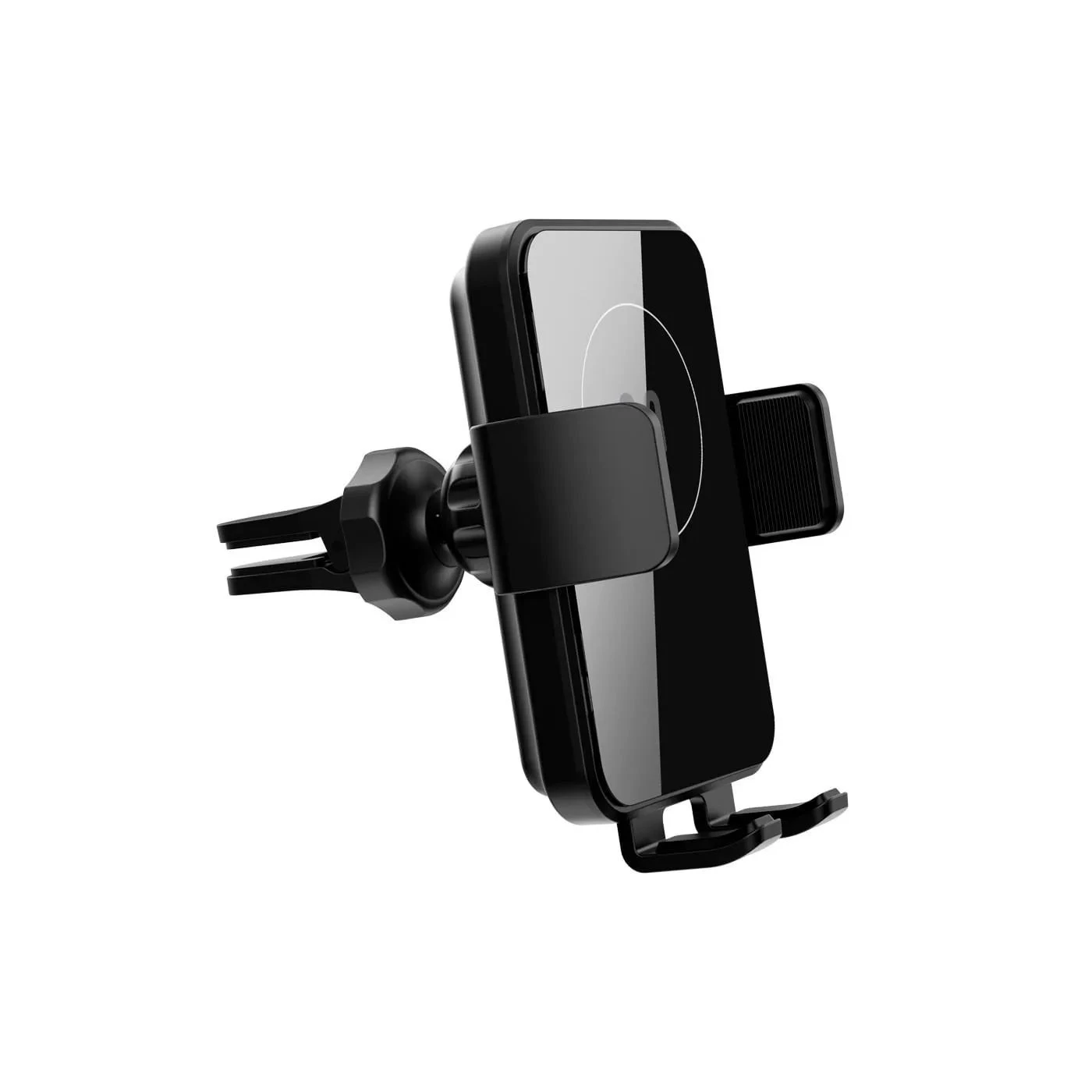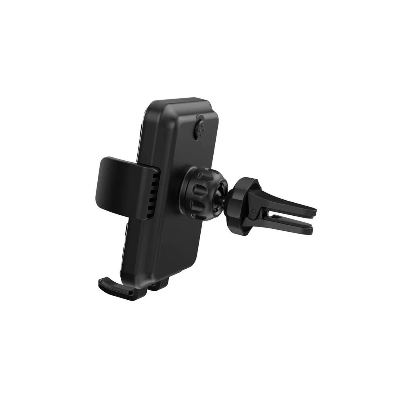 Carregador automotivo sem fio com 15w de potência. Além de ter a funcionalidade de um carregador automotivo sem fio, funciona também como um suporte veicular.