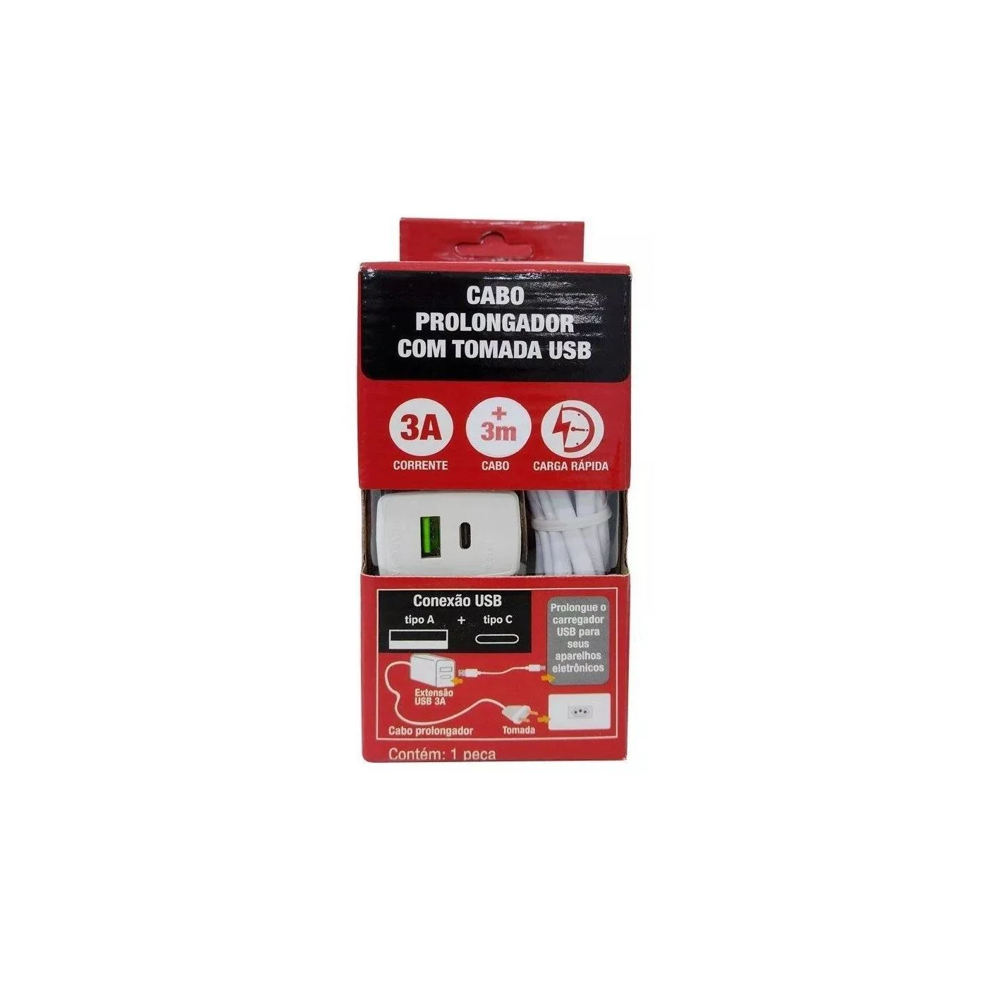 Extensão Cabo Prolongador Tomada Usb A+C 3A 3m - Force Line
