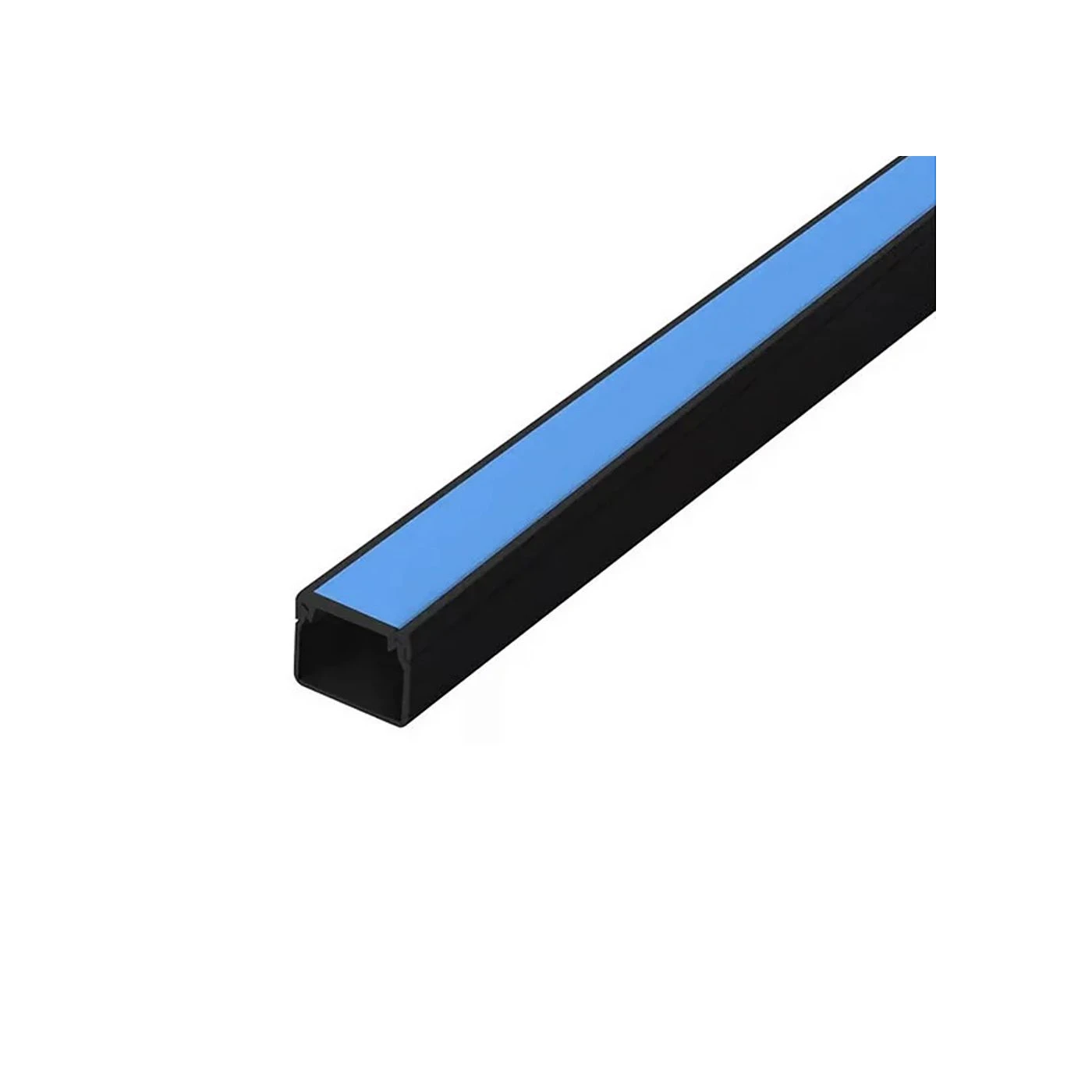 Canaleta Alumbra com tampa e fixação por adesivo, sem divisória. Fita dupla face que permite a instalação na alvenaria sem a utilização de parafusos. Feita em Termoplástico Preto.