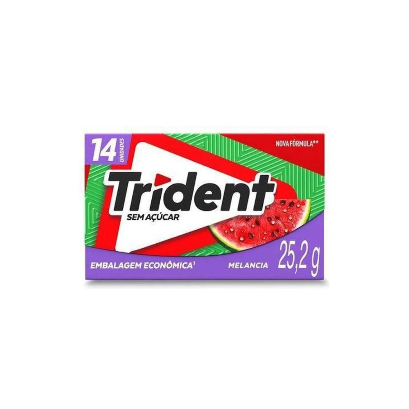 Chiclete Trident sabor melancia, em embalagem com 14 unidades. Produto da marca Trident, modelo clássico, ideal para manter o hálito fresco e proporcionar sabor duradouro. Sem adição de açúcar, indicado para consumo diário.