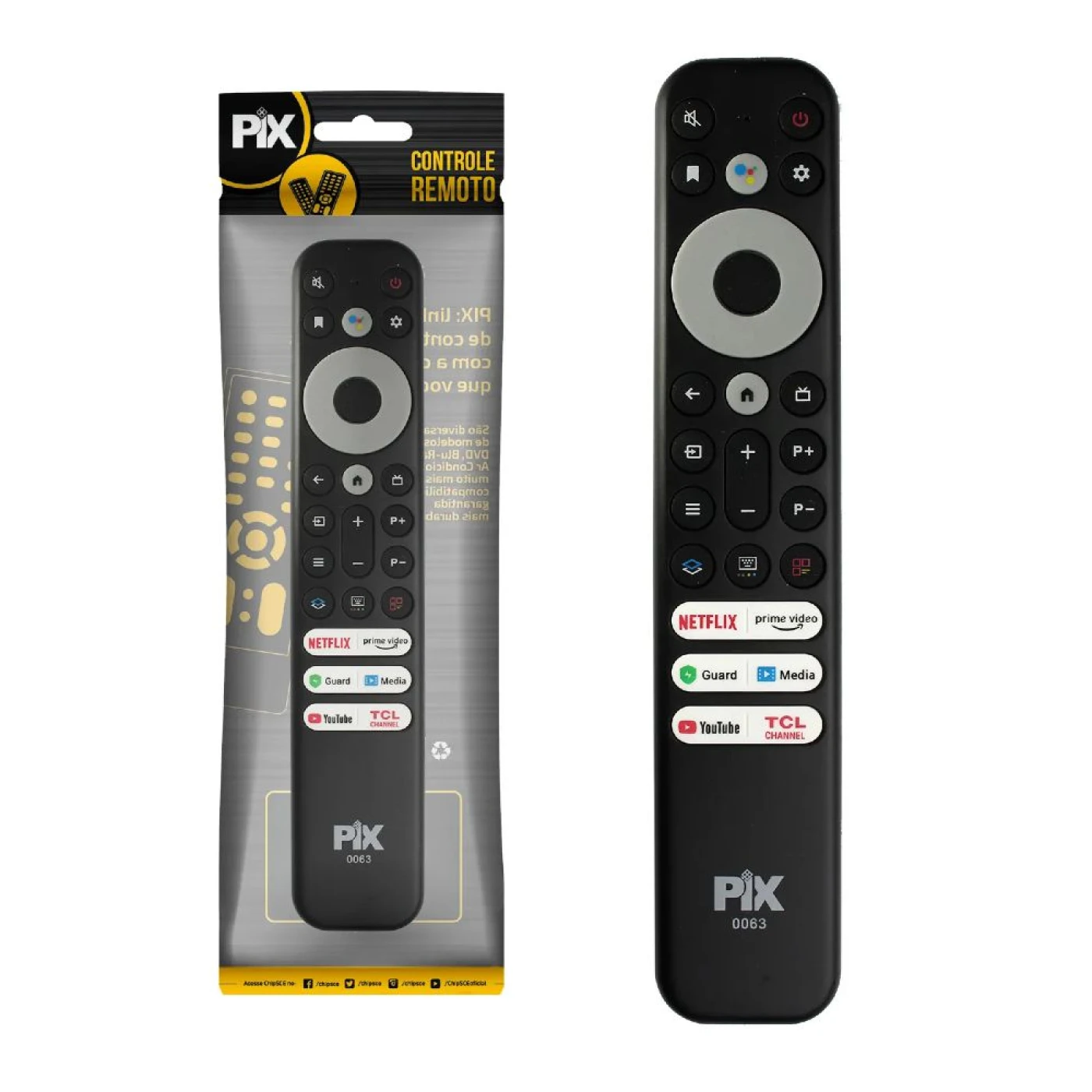Este é um controle remoto da marca Pix compatível com o modelo de TV Smart TCL 65P725. Ele possui teclas de atalho para Netflix, Prime Video, Guard, Media, Youtube e TCL Channel. Alimentado por duas pilhas AAA (não inclusas).