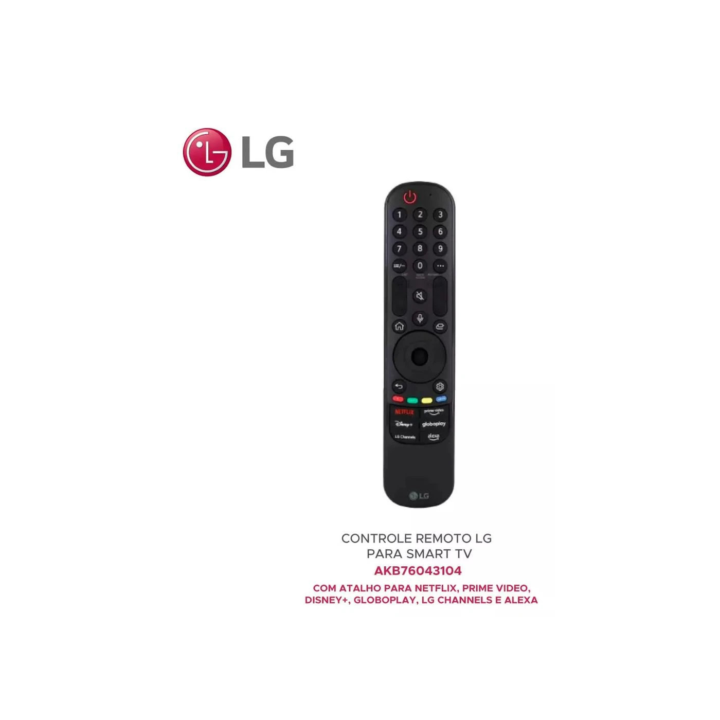 Este controle possui teclas de atalho para NETFLIX, PRIME VIDEO, DISNEY+, GLOBOPLAY, ALEXA e LG CHANNELS. A funcionalidade ALEXA está disponível apenas se a TV for compatível com esse recurso.