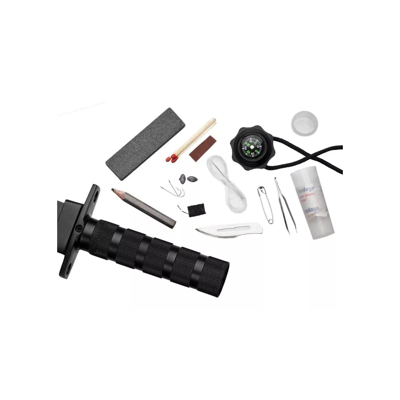 3 fosforos, papel para riscar, 2 anzois, lamina, linha, lápis, pinça, chumbinhos, alfinete