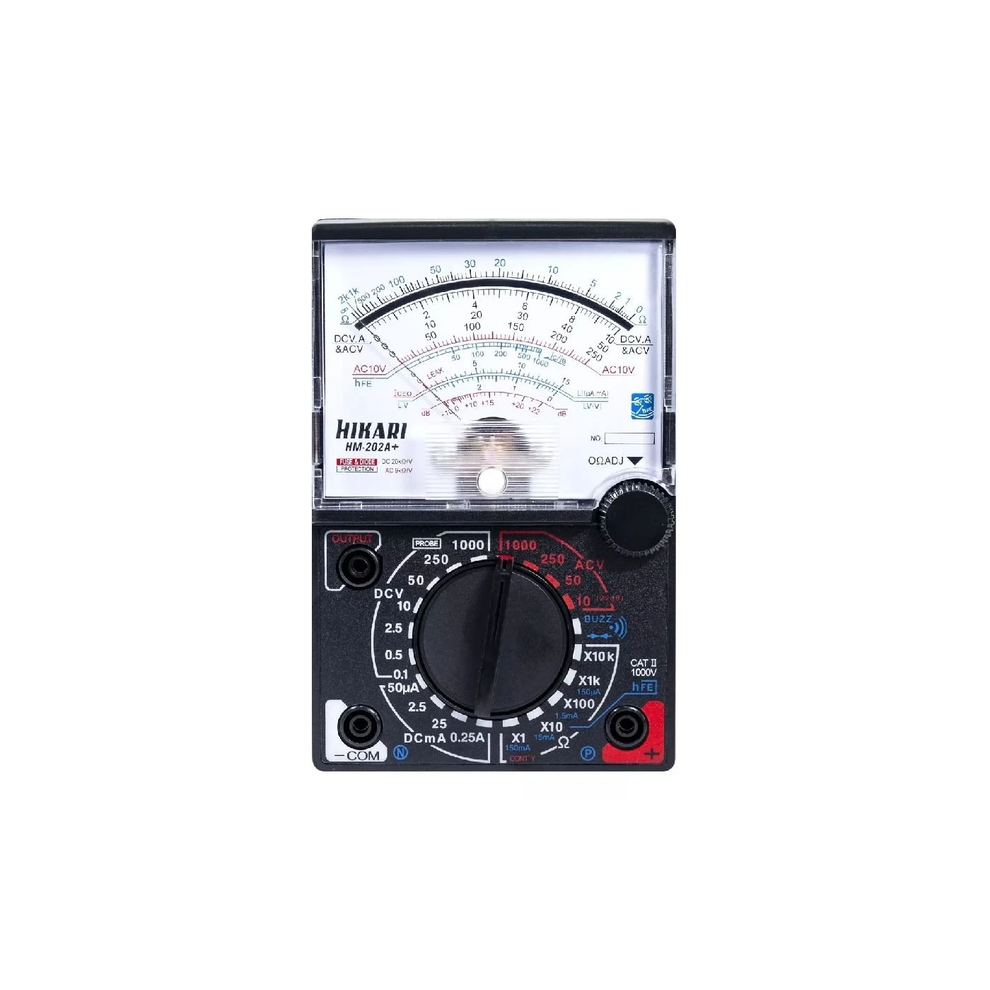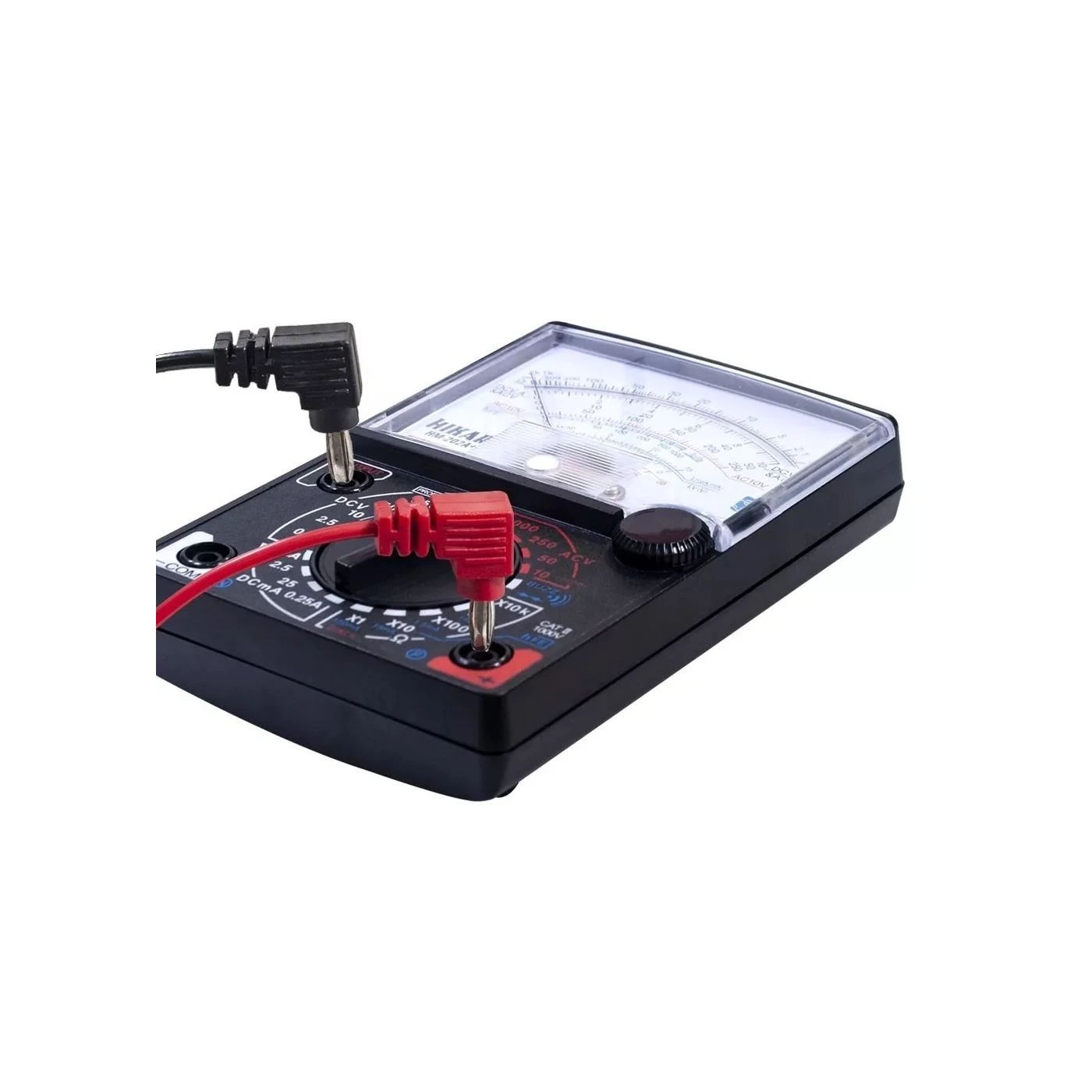Multímetro Analógico Modelo Hm-202a é um instrumento portátil com sistema de suspensão do galvanômetro tipo mancal e sensibilidade DC de 20kOhms/V, sensibilidade AC de 9kOhms/V. Realiza medidas de tensão DC e AC, corrente DC, resistência, teste de continuidade, decibel e transistor iceo.