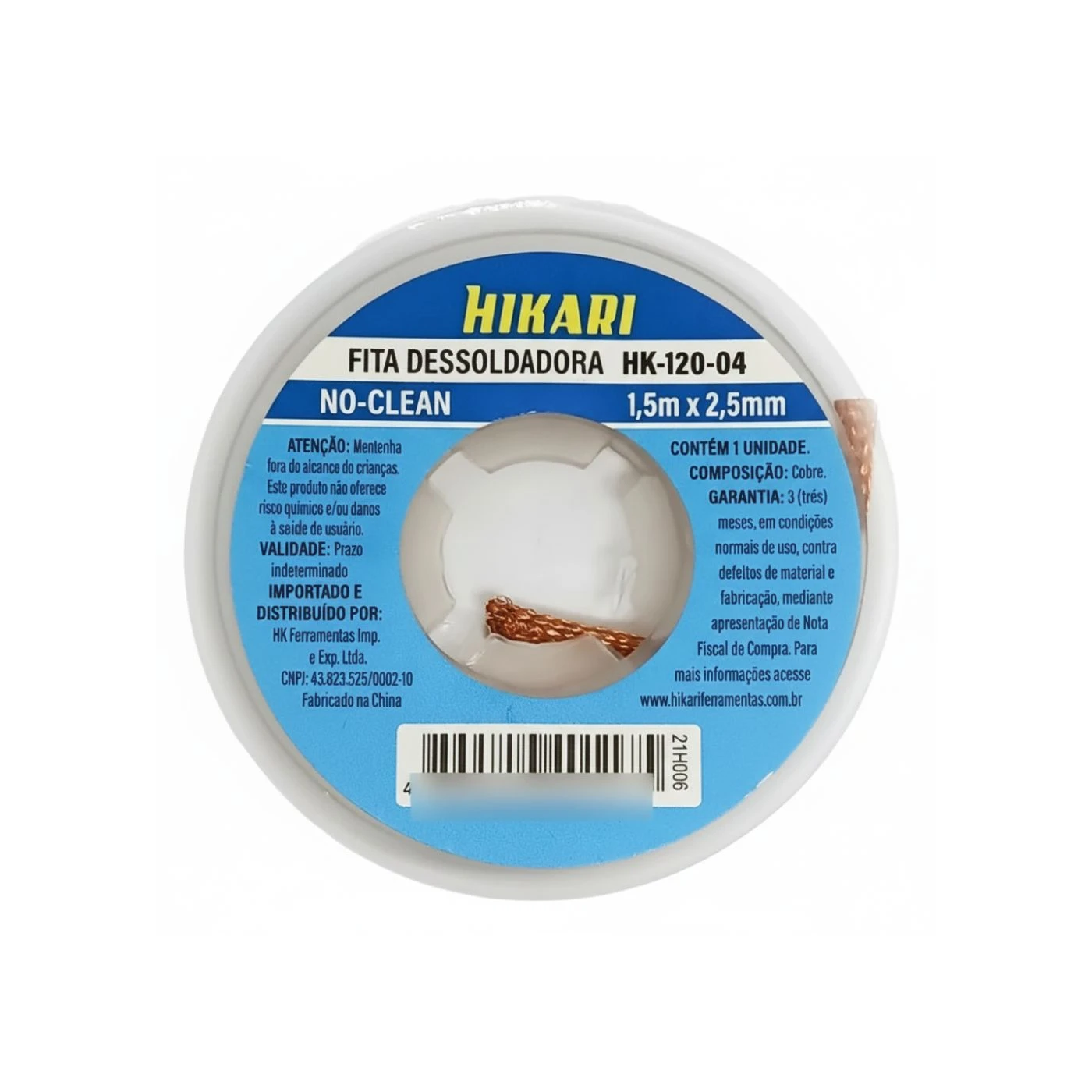 A Fita Dessoldadora HK120 da Hikari é ideal para remoção de solda em placas eletrônicas com precisão e eficiência. Fabricada com fios de cobre trançados de alta qualidade, oferece excelente condutividade térmica, garantindo rápida absorção da solda derretida e limpeza eficiente das trilhas sem danificar os componentes. Seu tamanho de 1.5 x 2.5 mm permite trabalhar em áreas pequenas e de difícil acesso, sendo indicada para uso profissional ou hobby de eletrônica. Fácil de manusear e compatível com ferros de solda padrão, esta fita é essencial para manutenção e reparos em circuitos eletrônicos.