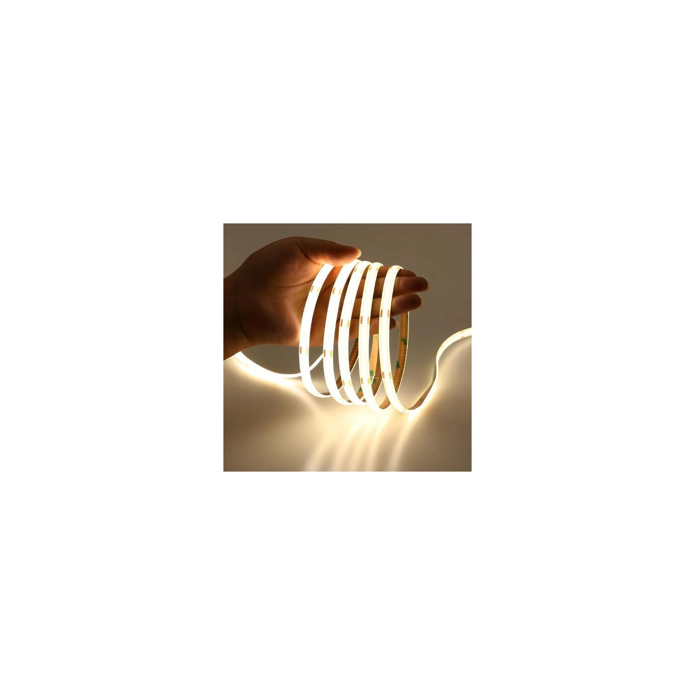 Fita LED COB da marca Astraled, modelo FT-5938, de alta eficiência, indicada para perfis de iluminação decorativa e funcional. Possui luz amarela quente 3000K, baixo consumo de 11W por metro e comprimento de 5 metros. Ideal para ambientes internos, proporciona iluminação uniforme e com alto índice de reprodução de cor (IRC92), garantindo cores mais fiéis e naturais.