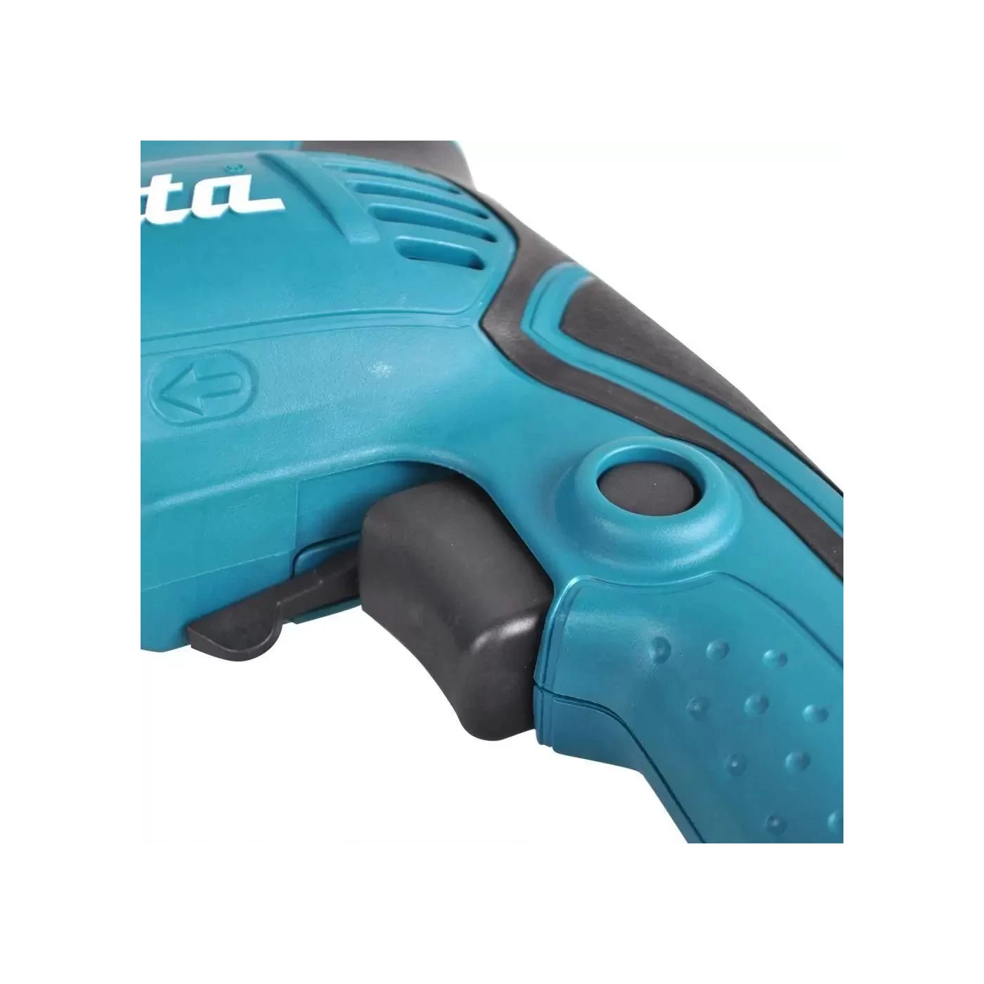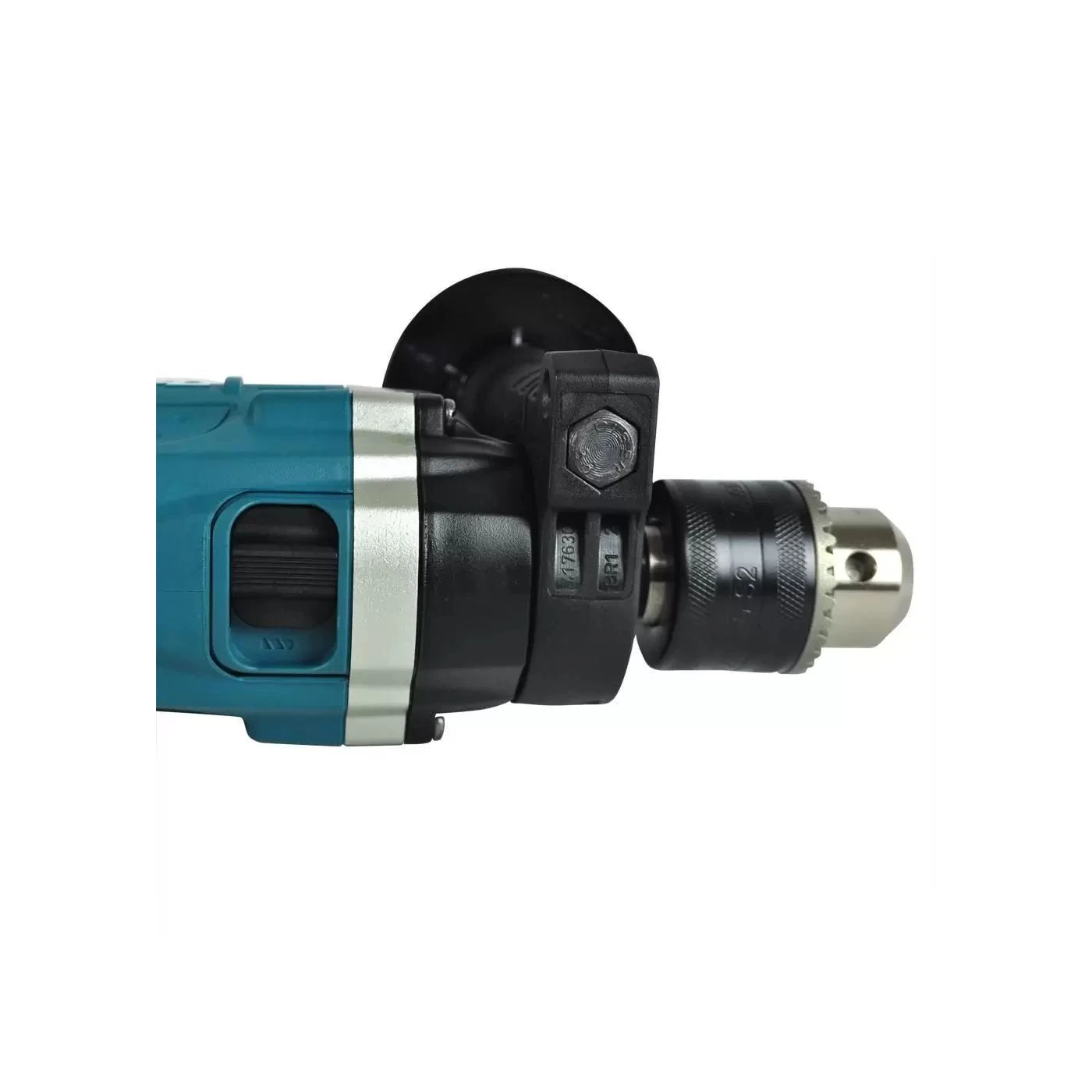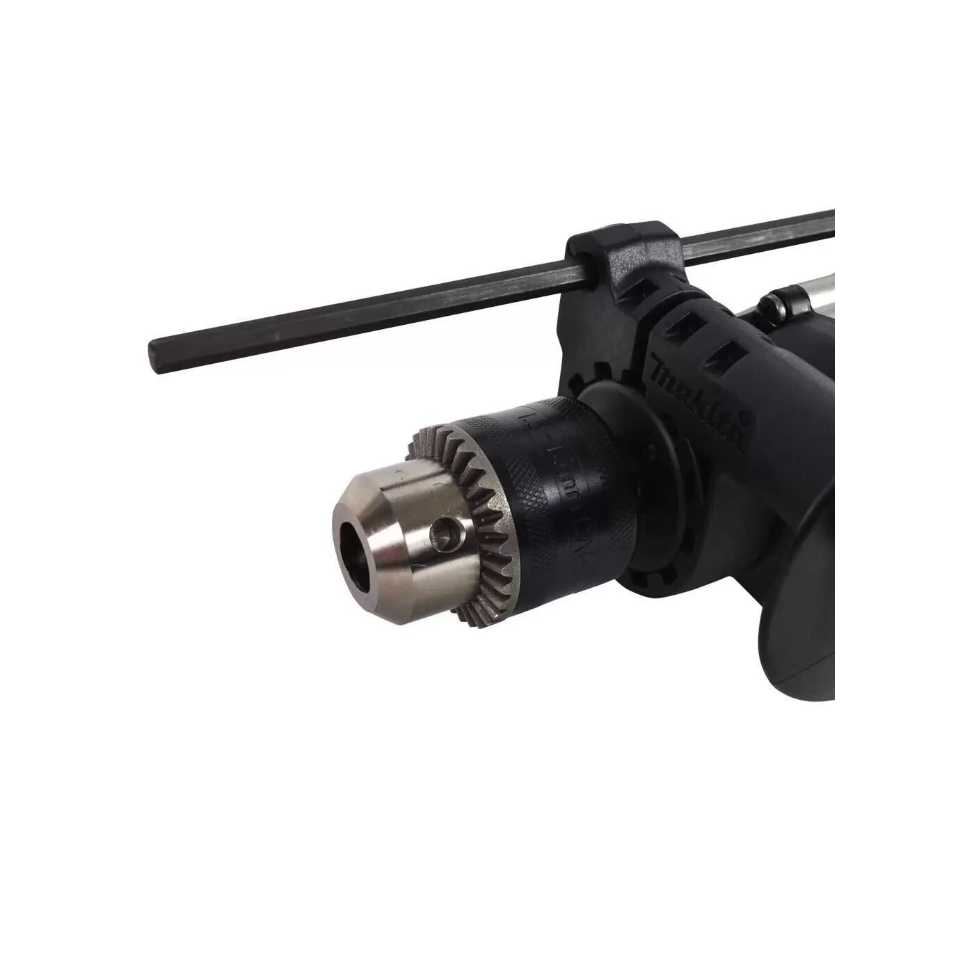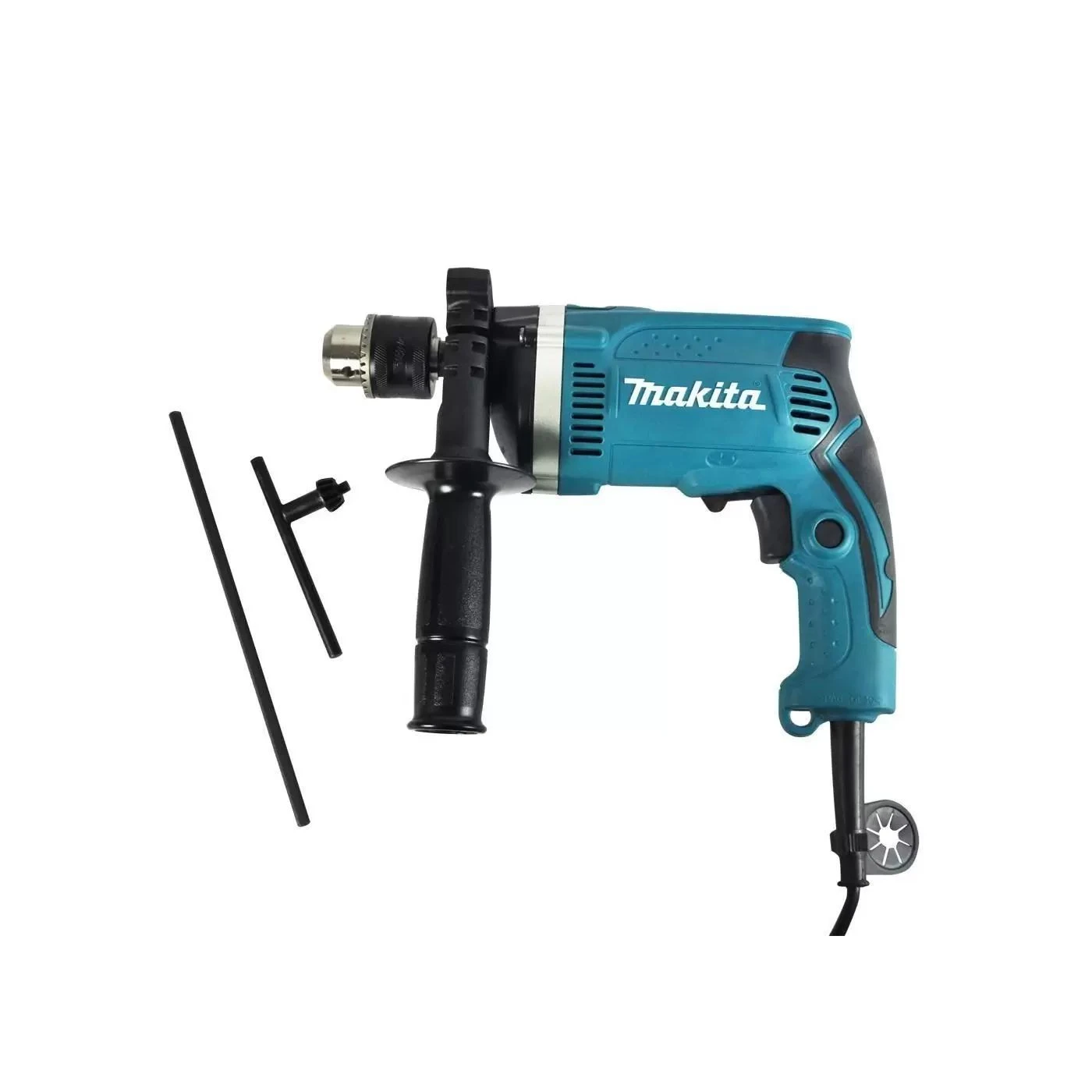 Junto com a furadeira HP1630K você recebe o punho lateral que ajuda a ter mais estabilidade na hora do furo, chave de mandril, maleta para armazenar e carregar a furadeira e um limitador de profundidade para medir a profundidade do seu furo.