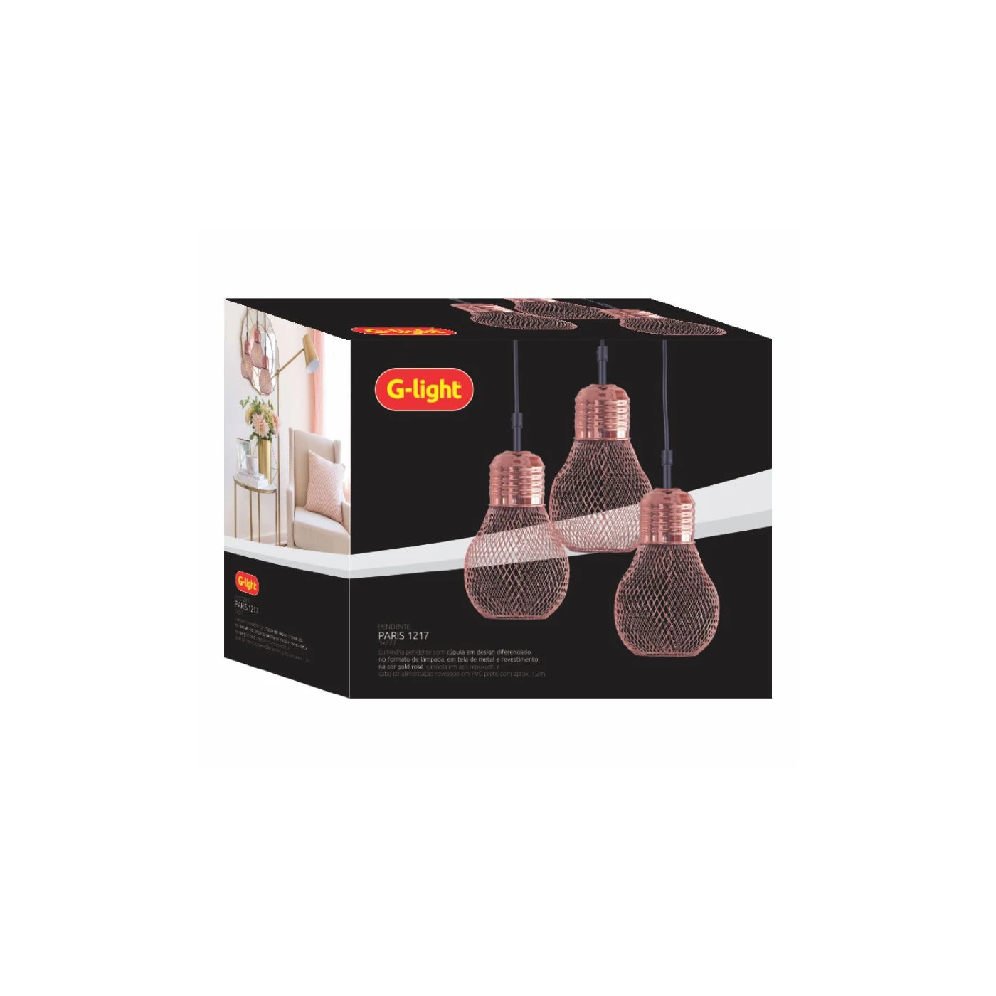Possuem acabamento na cor gold rosé e carregam o estilo retrô, dando uma aparência luxuosa, atraente e personalidade única. São indicadas para iluminação decorativa de ambientes internos como salas de estar, jantar, halls, recepções, salas de espera, bares, restaurantes e áreas gourmet.