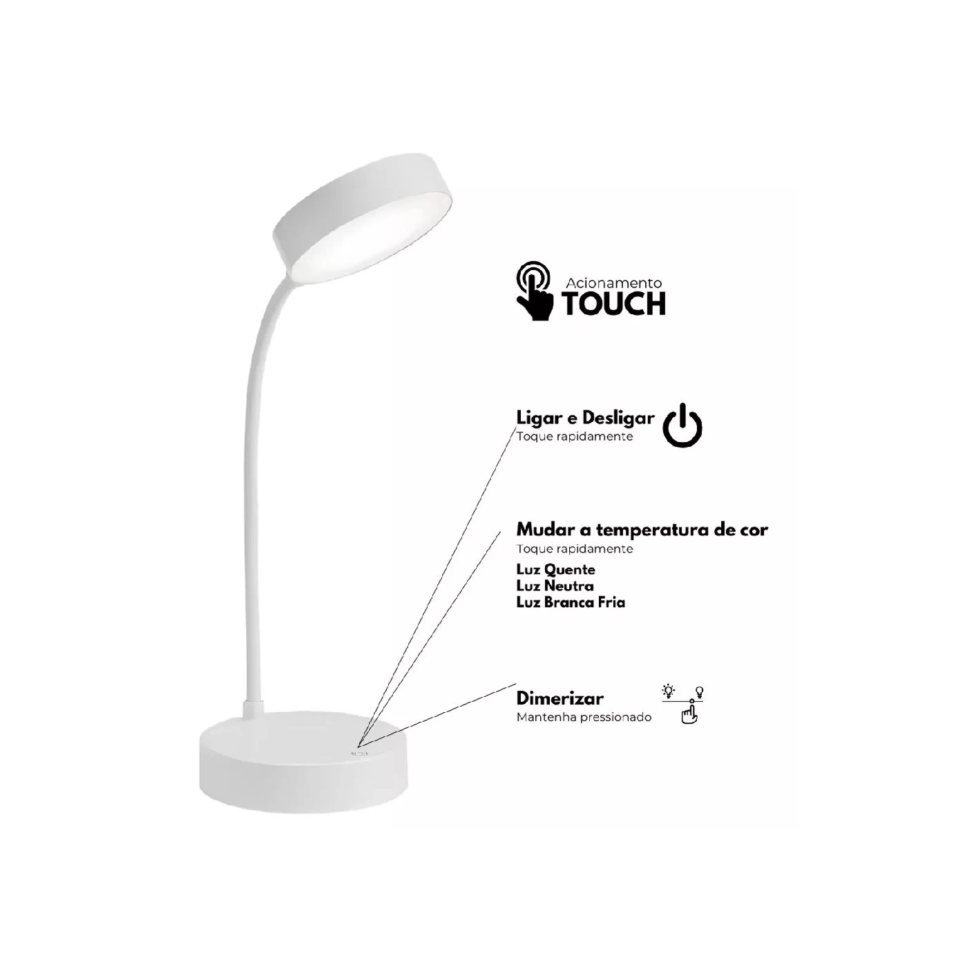 Luminária de mesa articulável com 3 níveis de iluminação moderna inovadora e decorativa, ideal para estudo, trabalho, simples e prática.