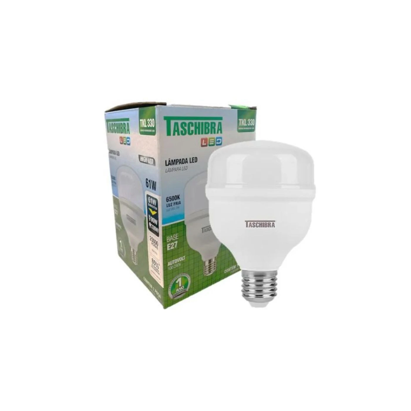 Lâmpada LED de alto desempenho ideal para iluminação residencial e comercial, com eficiência energética e longa durabilidade. Proporciona luz branca fria de 6500K, perfeita para ambientes que exigem claridade e economia. Produto da marca Taschibra, modelo TKL330, com base E27 e potência de 61W.