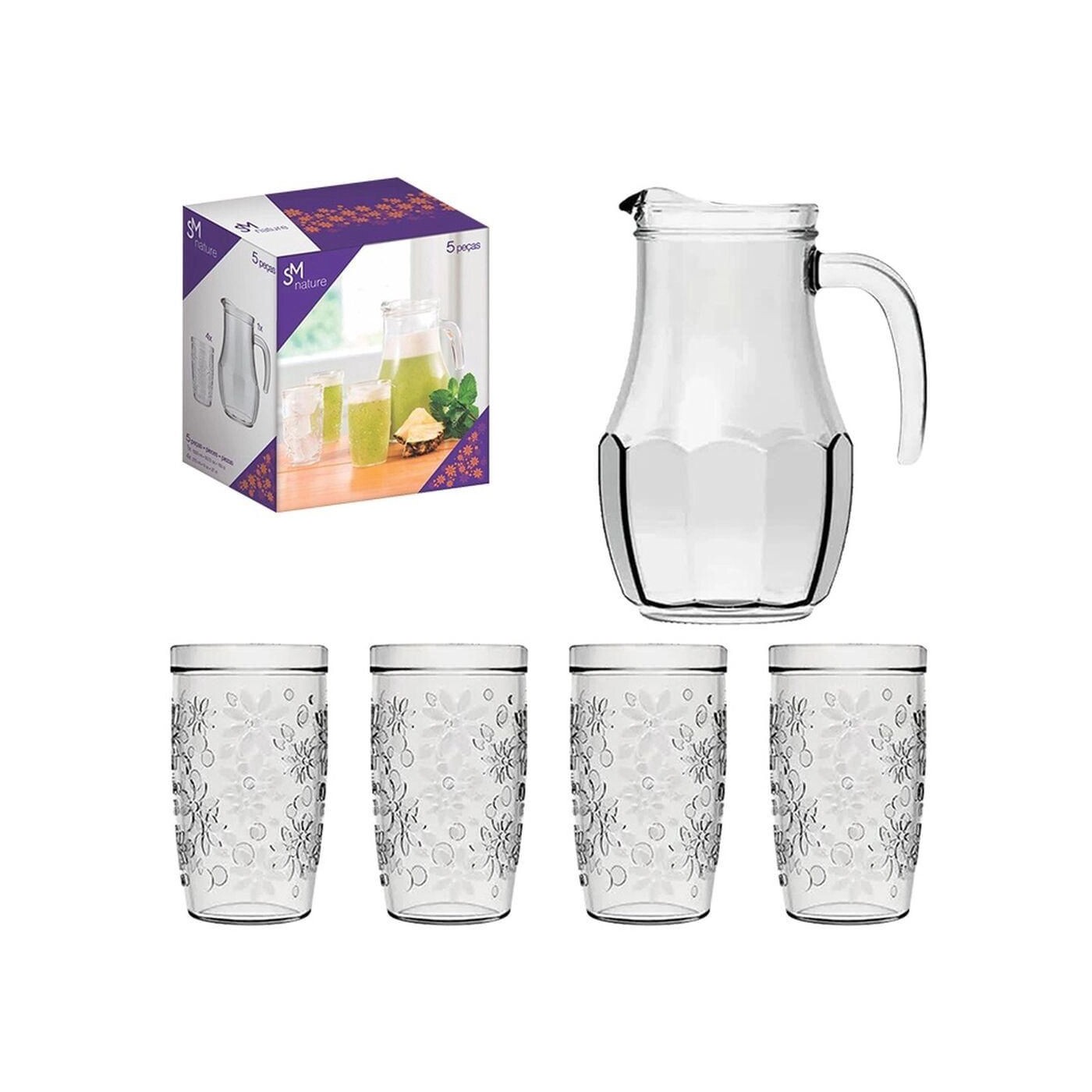Apresentamos o Conjunto Nature Sm Nadir, composto por uma jarra de vidro e quatro copos. Este conjunto é perfeito para servir suas bebidas favoritas com estilo e elegância. A jarra tem uma capacidade de 1,5 litros, ideal para servir sucos, água ou chás para toda a família ou amigos.
