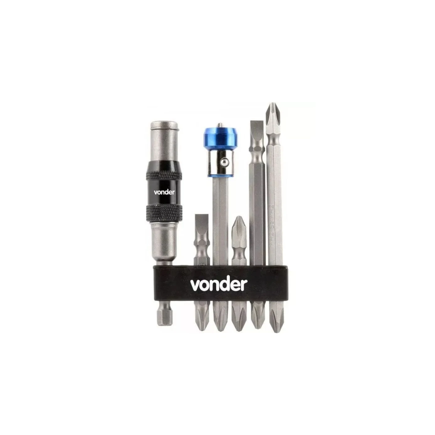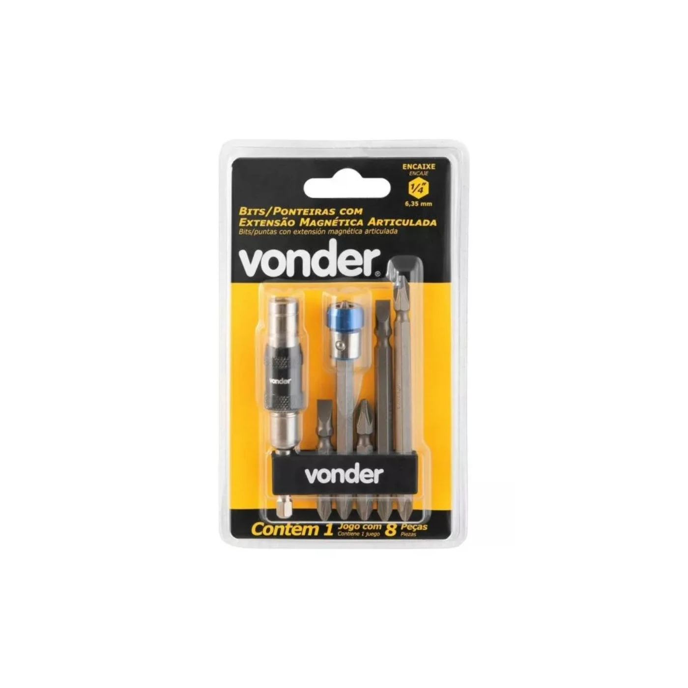 Jogo de bits/ponteiras com 8 peças, encaixe sextavado de 1/4", com extensão magnética articulada, VONDER 35.38.000.008 Fabricado em aço especial S2, que possui propriedades superiores em termos de resistência, proporcionando maior durabilidade. A extensão magnética, por ser articulada, auxilia em locais de difícil acesso e permite um alcance de até 20°. Indicado para fixar e soltar parafusos em geral. Conteúdo da Embalagem: 1 Jogo com 8 peças, sendo: 5 bits/ponteiras duplos (3 PH2/PH2; 2 PH2/fenda 6 mm), 1 extensão magnética articulada, 1 anel magnético e 1 suporte plástico. DETALHES TÉCNICOS Quantidade de peças:8 peças Tipo do encaixe do bits:Sextavado - 1/4" (6,35 mm) Comprimento total do bits/ponteira:1 bits - PH2 / PH2 (90 mm de comprimento); 1 bits - PH2 / PH2 (100 mm de comprimento); 1 bits - PH2 / 6 mm (90 mm de comprimento); 1 bits - PH2 / PH2 (50 mm de comprimento); 1 bits - PH2 / 6 mm (50 mm de comprimento) Material do bits/ponteira:Aço S2 (Especial) Acabamento do bits:Fosfatizado Massa aproximada (peso):0,78 kg