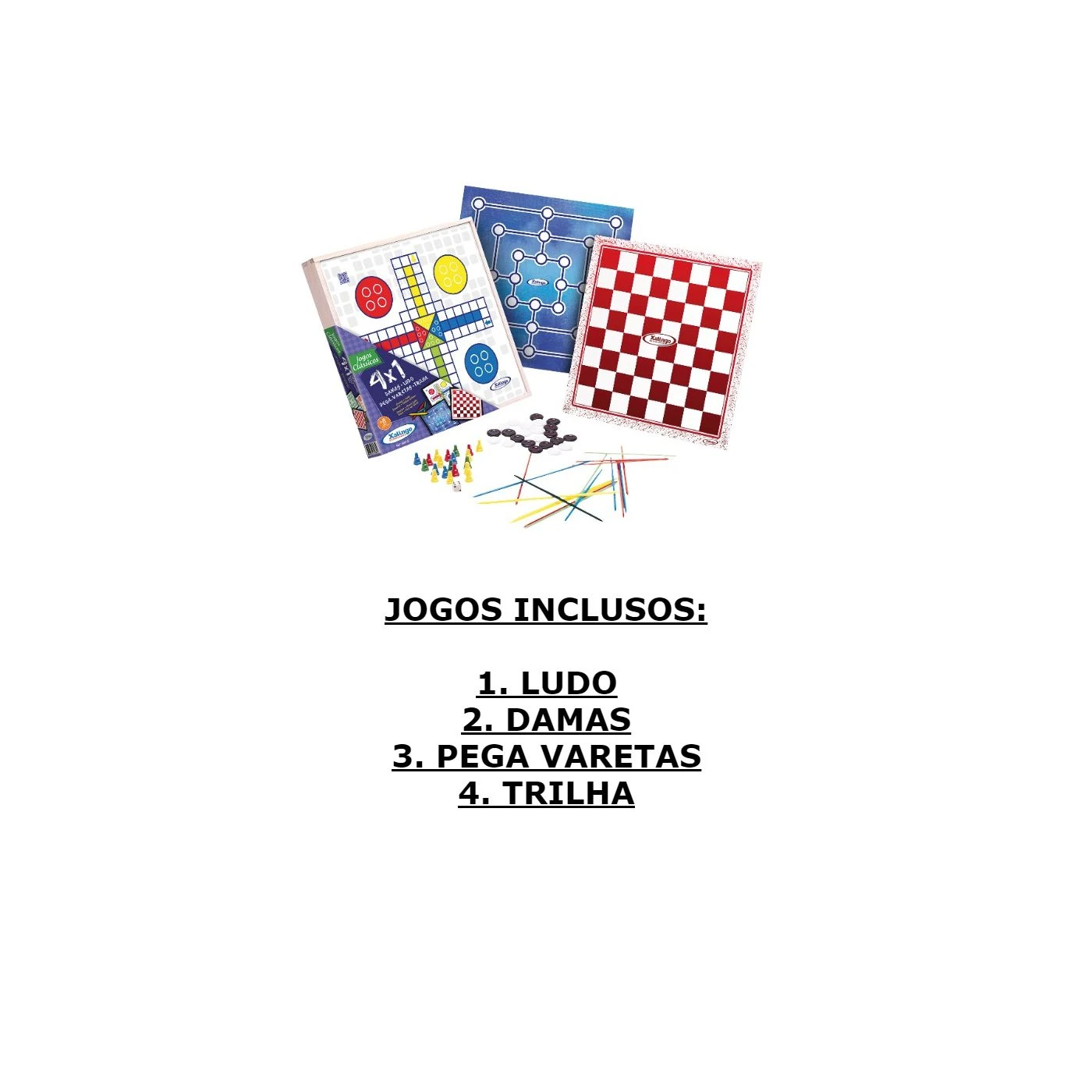 - Modelo: Jogo 4x1 (Damas, Ludo, Pega Varetas e Trilha)