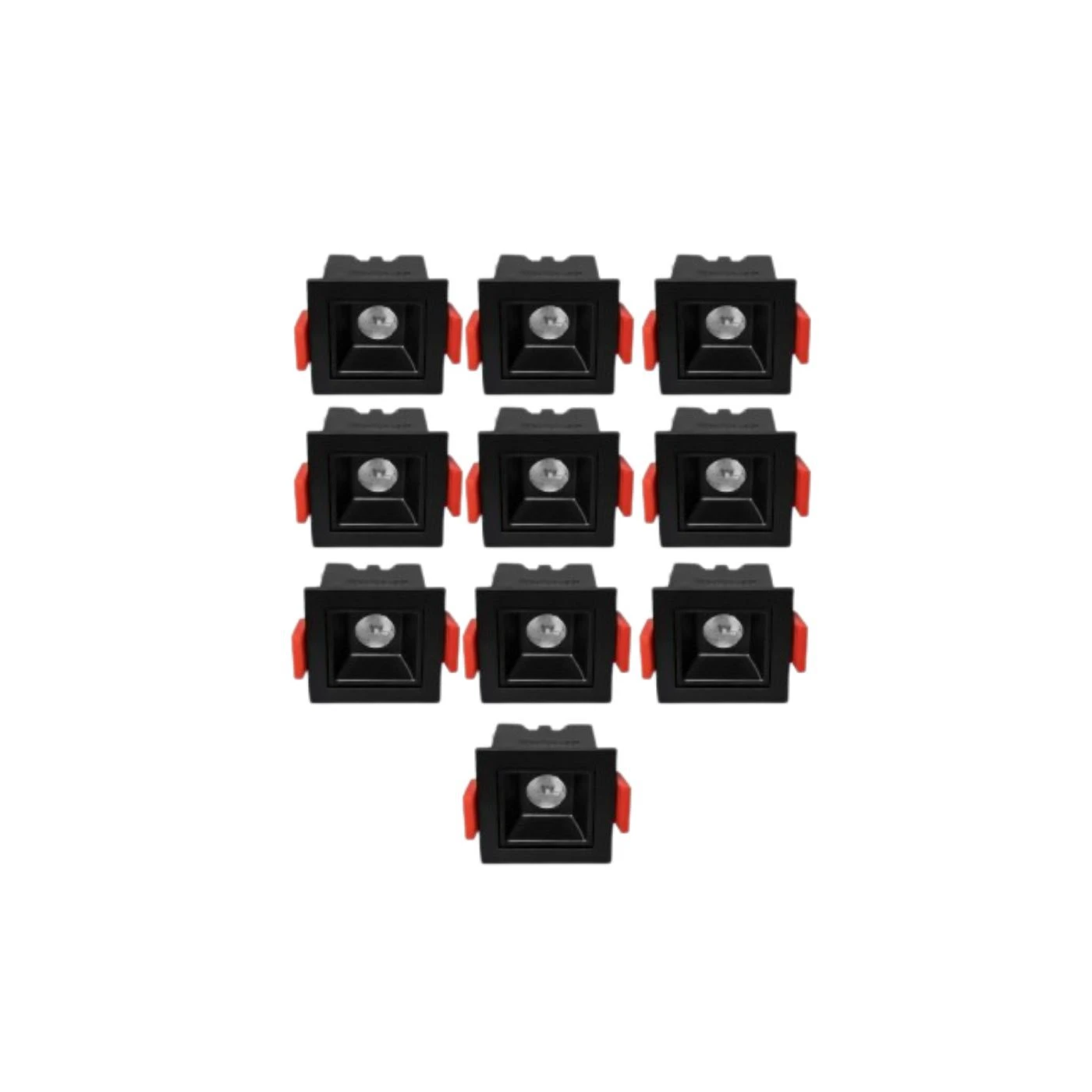 KIT 10 UN Downlight LED de embutir com 2W, luz quente 3000K, corpo preto e formato quadrado. Econômico, compacto e fácil de instalar, ideal para iluminação residencial.