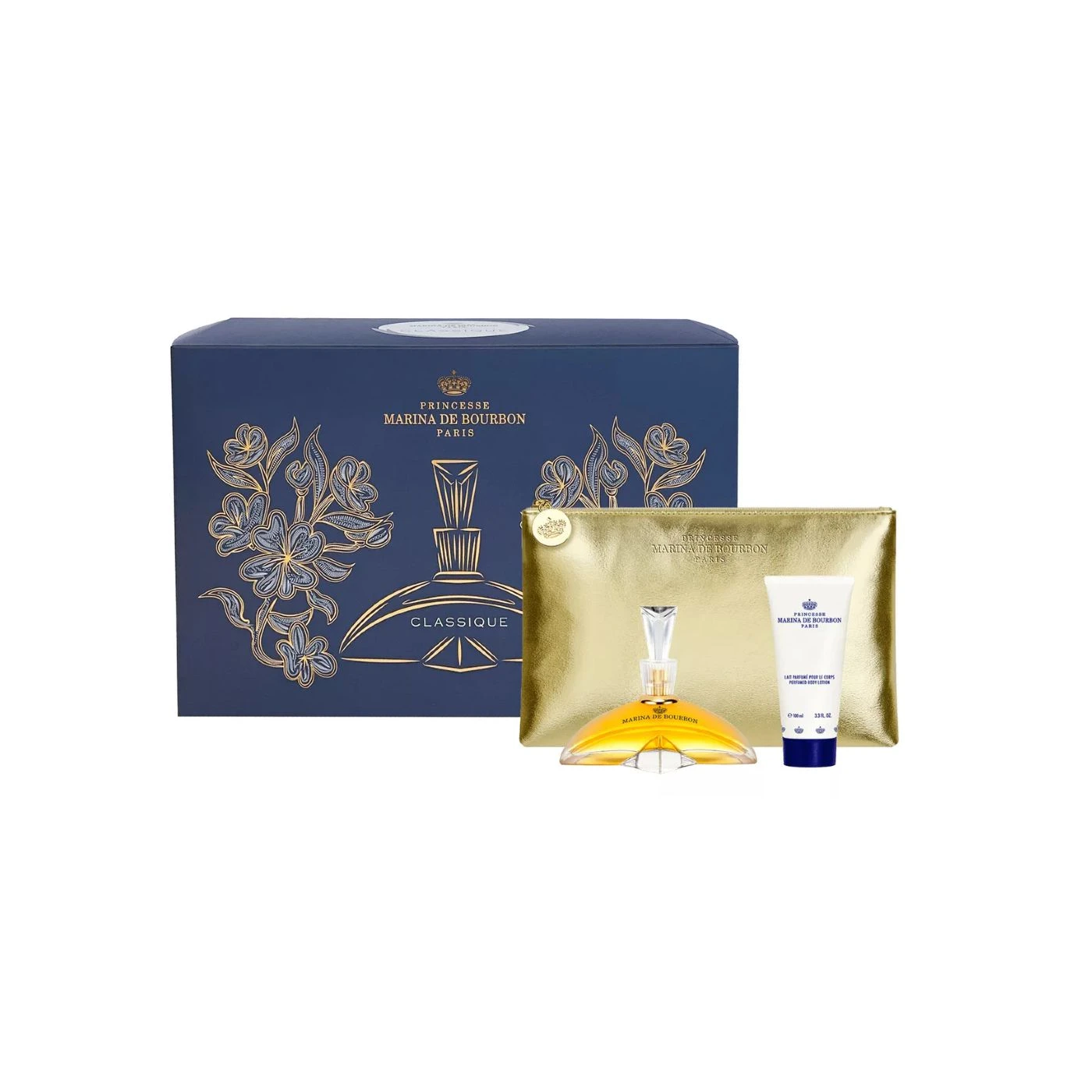 Conjunto feminino com perfume Classique frutal floral oriental, e body lotion Marina de Bourbon. Exala a natural elegância do requinte e do sucesso.