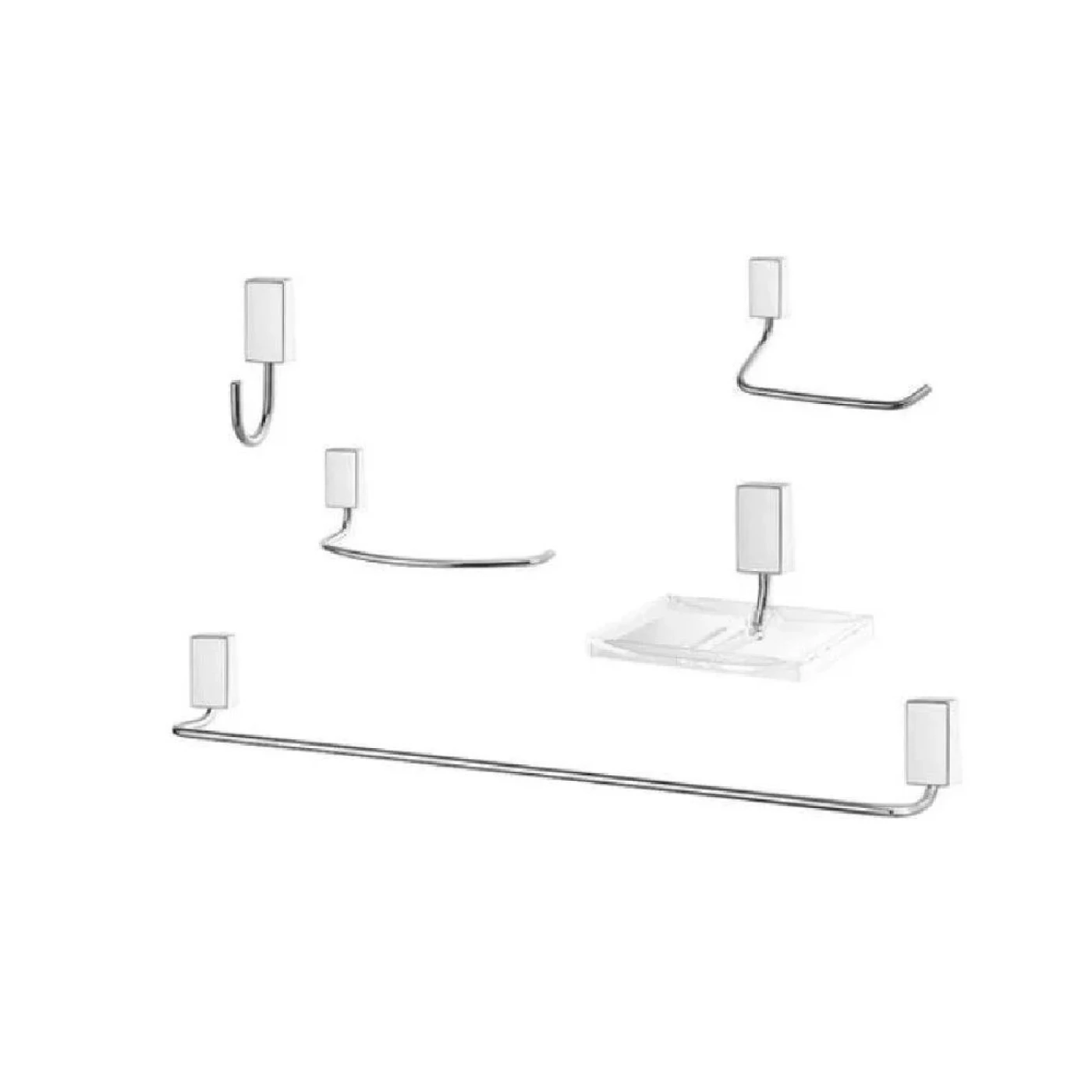 Conteúdo: saboneteira, papeleira, toalheiro barra e argola, cabide e kits de fixação.