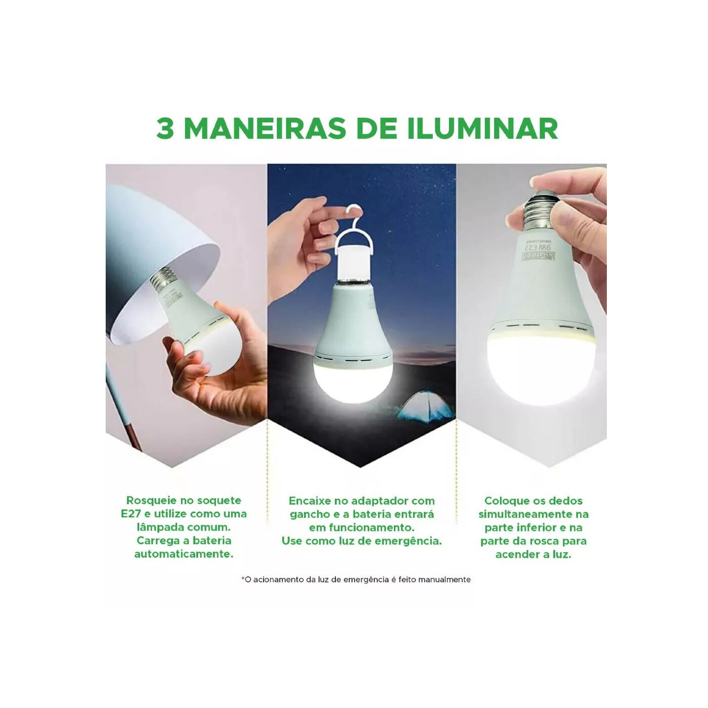 Enquanto ligada na energia, funciona como uma lâmpada convencional e em casos de falta de energia, você pode conectar no soquete que acompanha e terá luz por até 4 horas.