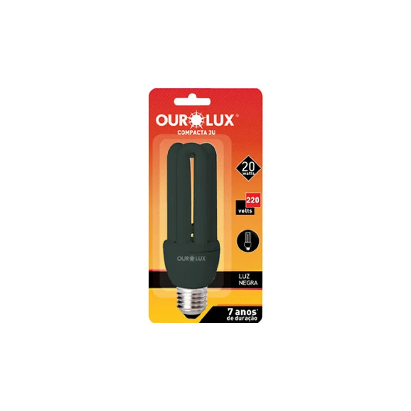 A lâmpada Luz Negra Ourolux tem o bulbo na cor preta, quando apagada. Quando acesa, apresenta iluminação tênue, porém com alta quantidade de luz ultra-violeta, o que permite a criação de vários efeitos decorativos.