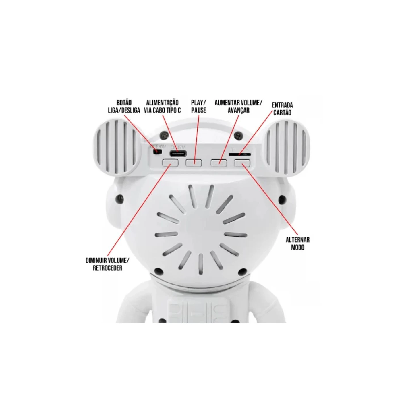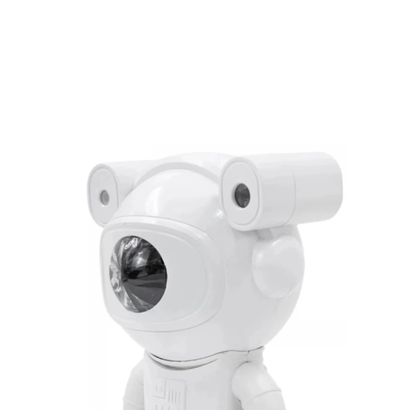 Este projetor em formato de astronauta projeta imagens de estrelas e nebulosas de forma nítida. O projetor acompanha controle remoto, que permite o comando à distância.